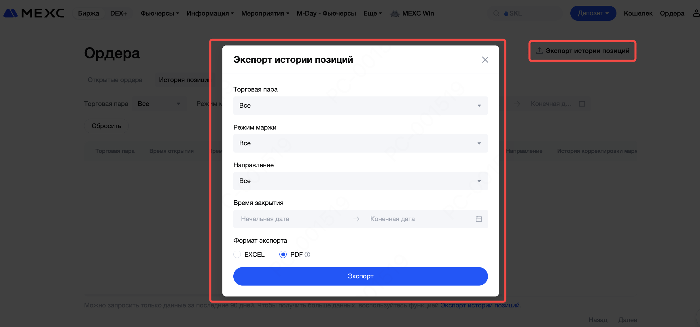 В настоящее время MEXC поддерживает экспорт данных истории фьючерсных позиций только на веб-сайте; в приложении эта функция пока недоступна.
