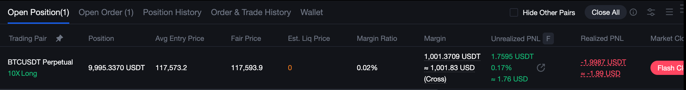 В торговле фьючерсами, как только вы открыли позицию, она появится в разделе «Открытые позиции». Список открытых позиций включает в себя торговую пару, позицию, среднюю цену входа, справедливую цену, расчетную цену ликвидации, ставку маржи, маржу, нереализованный PNL, реализованный PNL, мгновенное закрытие, TP/SL, закрытие позиции, обратная позиция и многие другие поля данных и кнопки действий.