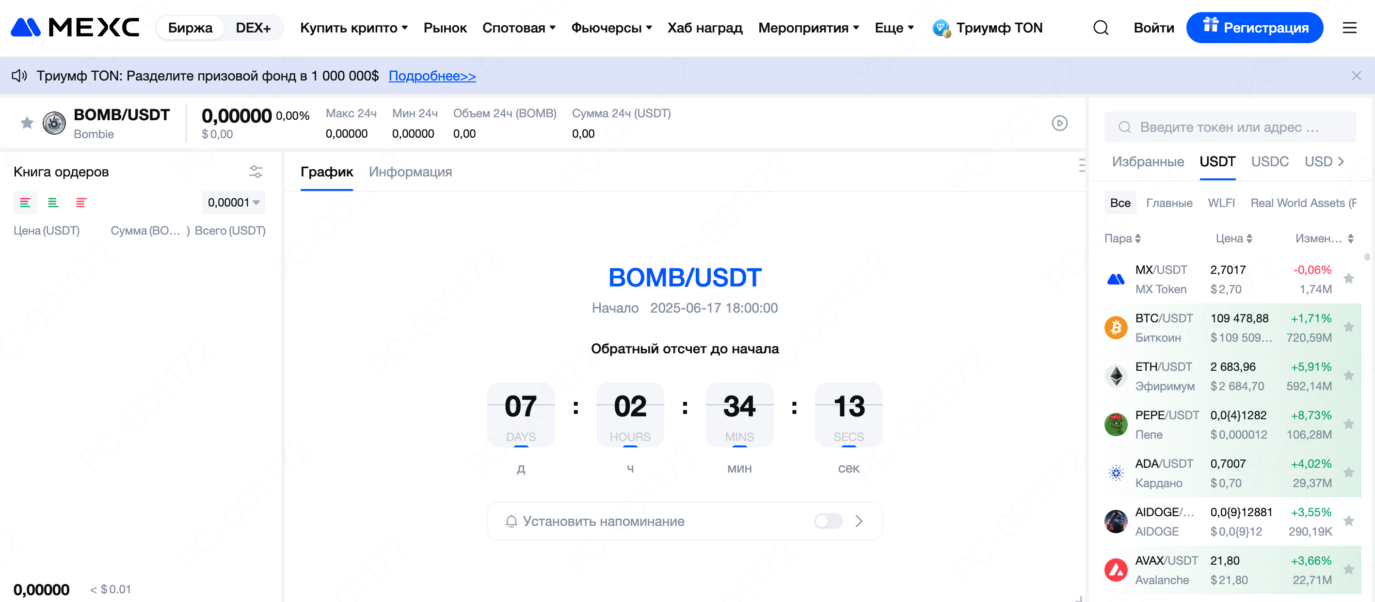 2) В строке поиска введите BOMB и выберите спотовую или фьючерсную торговлю.