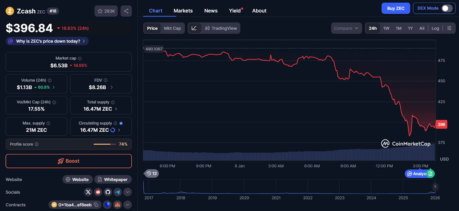 Основные показатели Zcash по состоянию на 8 января 2026 года. Данные: CoinMarketCap.