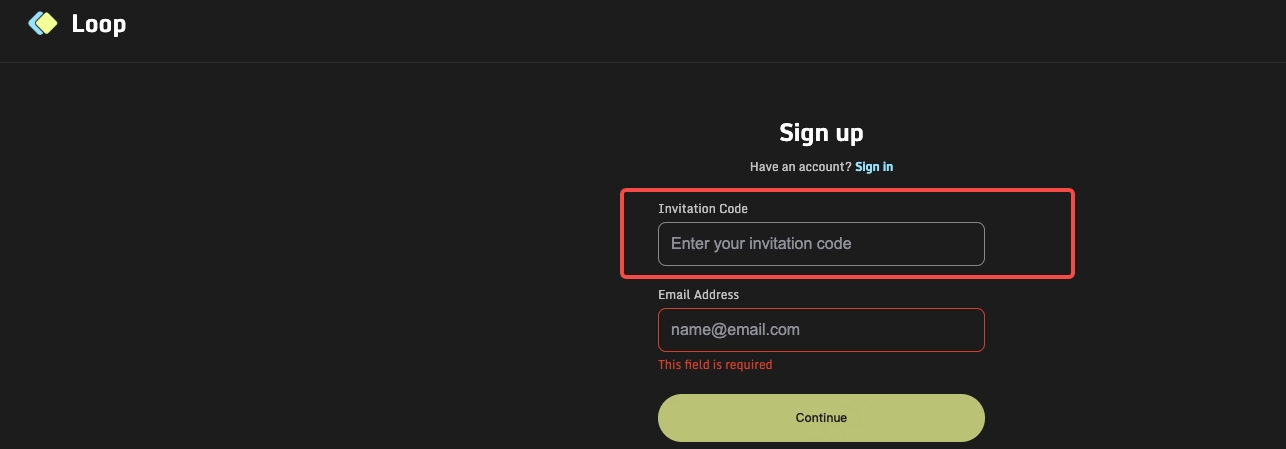 Visit the official Loop account creation page to begin the sign-up process. On the create an account page, you will need to provide two pieces of information: an invitation code and an email address. The invitation code is required. If you do not yet have one, please contact the Loop project team to obtain it. After completing the required fields, follow the on-screen instructions to finish signing up.