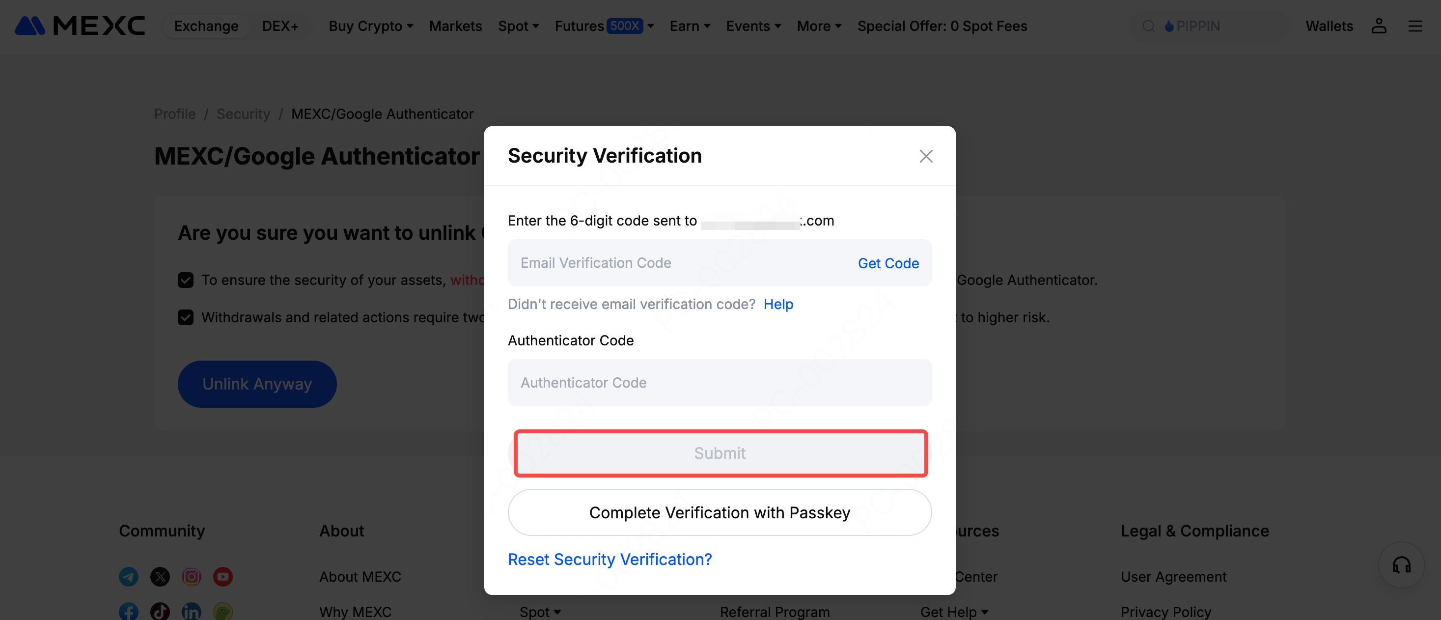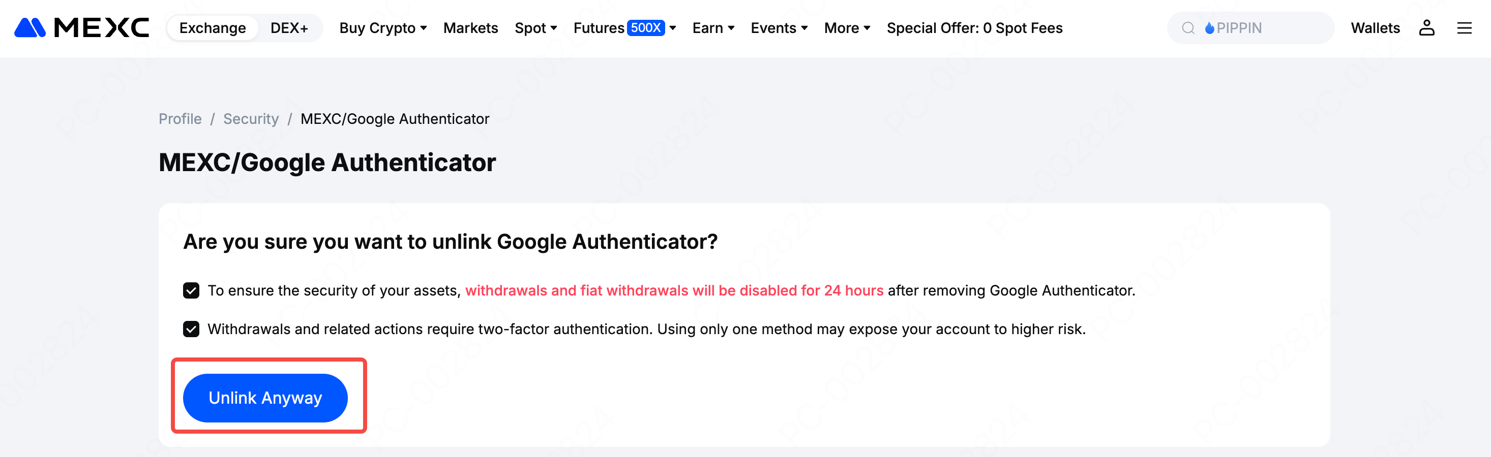 On the MEXC/Google Authenticator Code page, check and review the unlink notice and click Unlink Anyway.