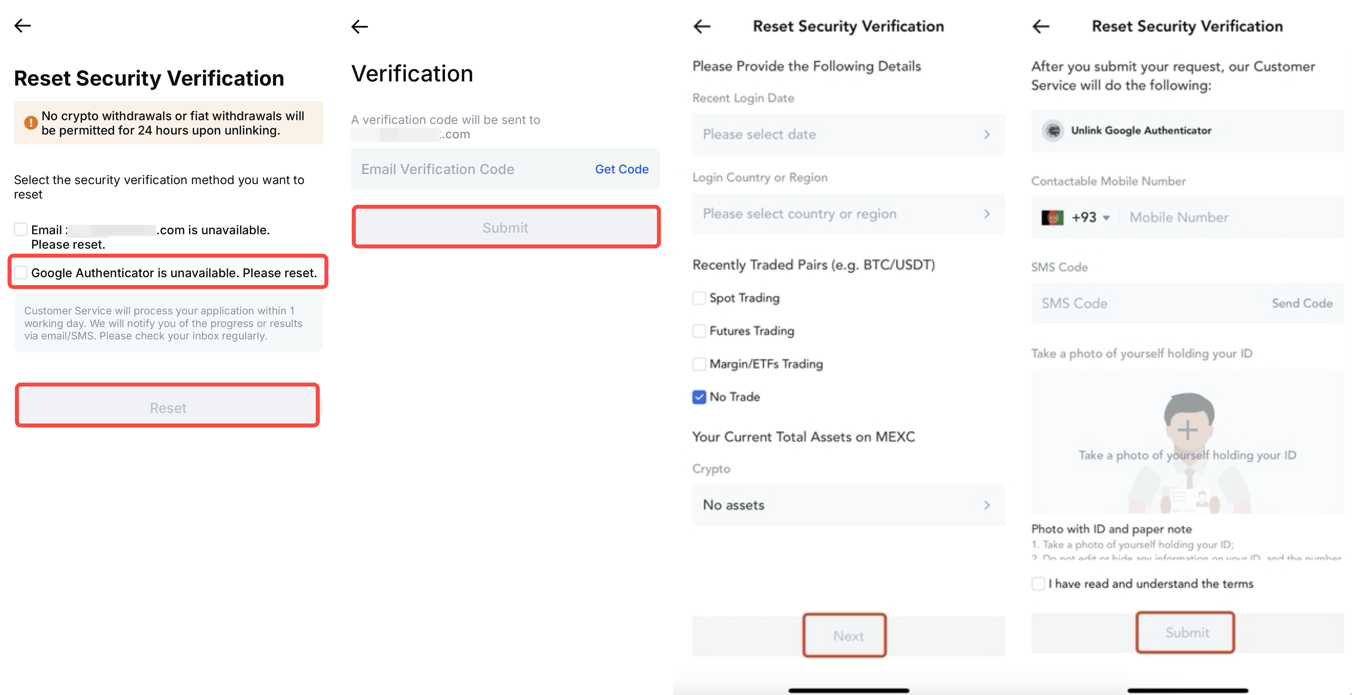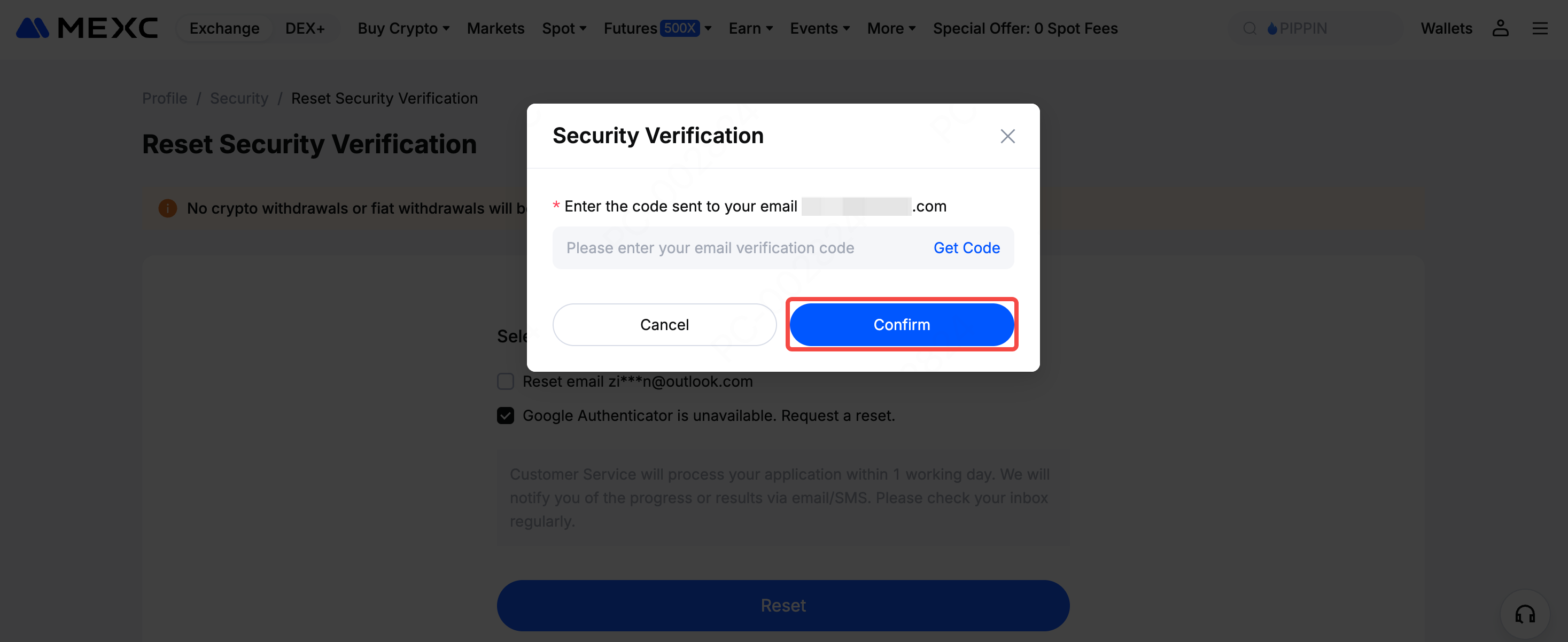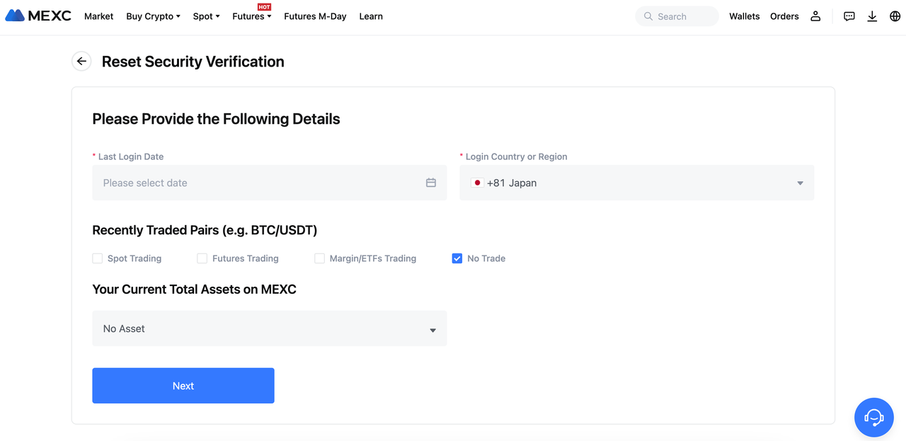 If your Google Authenticator is lost and you cannot enter the MEXC/Google Authenticator code, click Reset Security Verification?