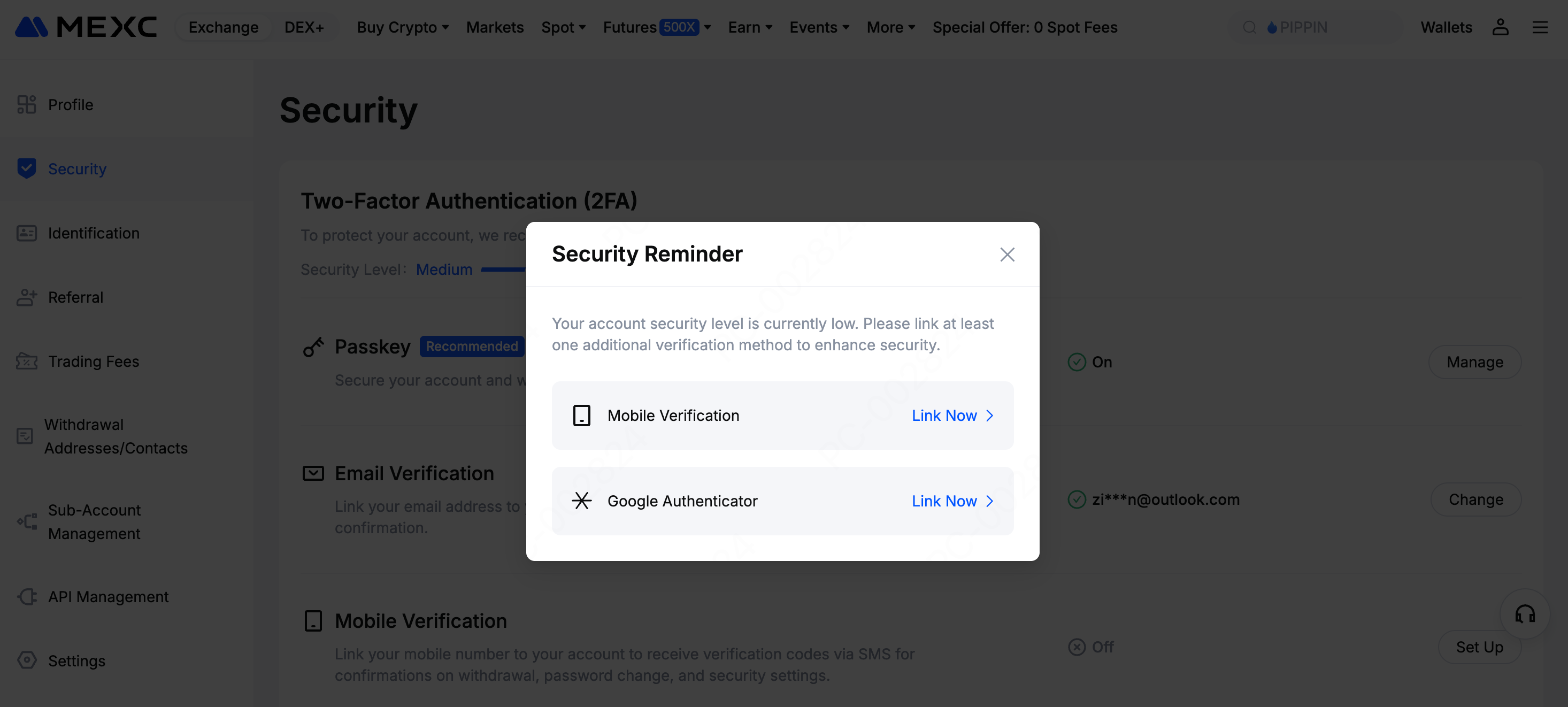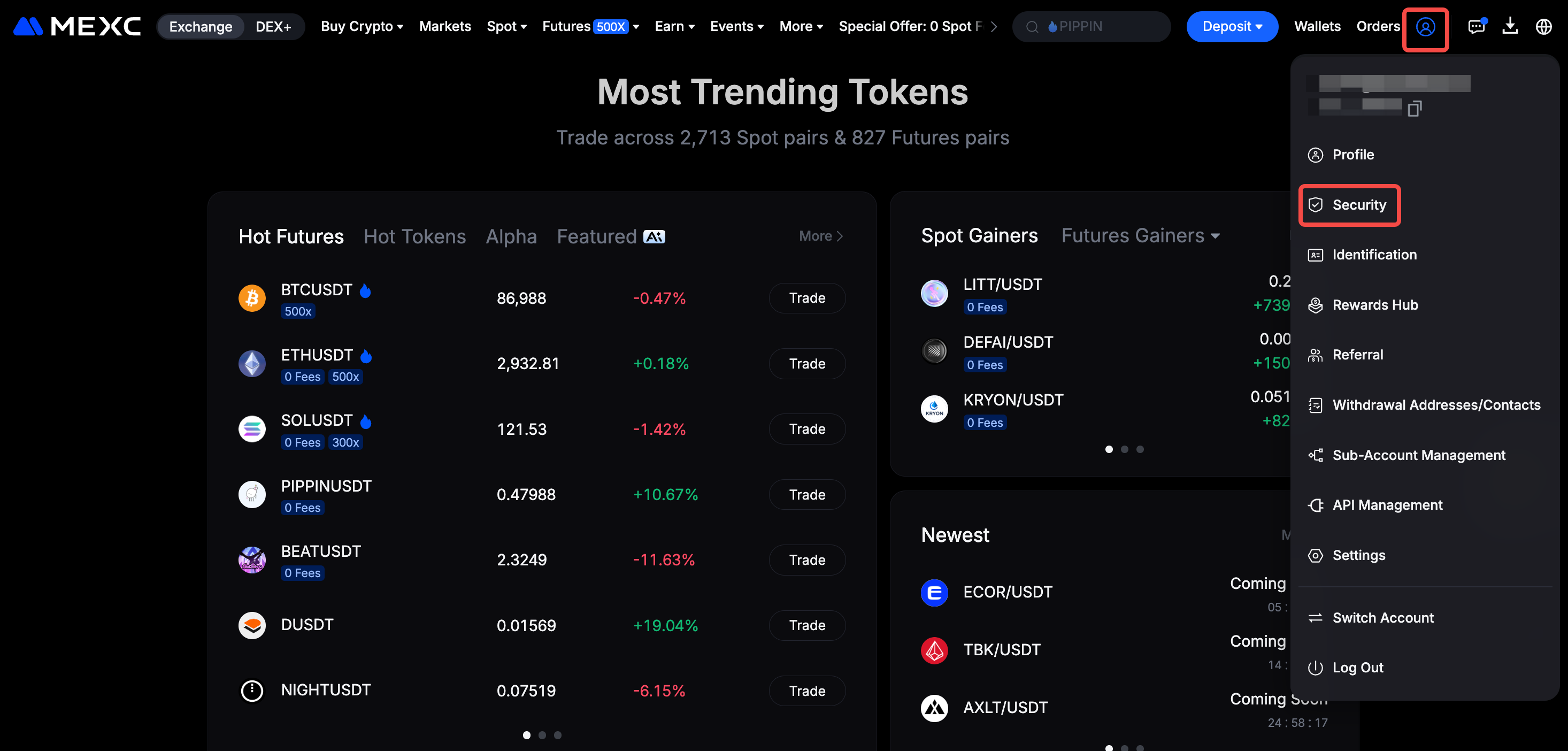 Open the MEXC official website and log in to your account. From the profile icon on the homepage, select Security.