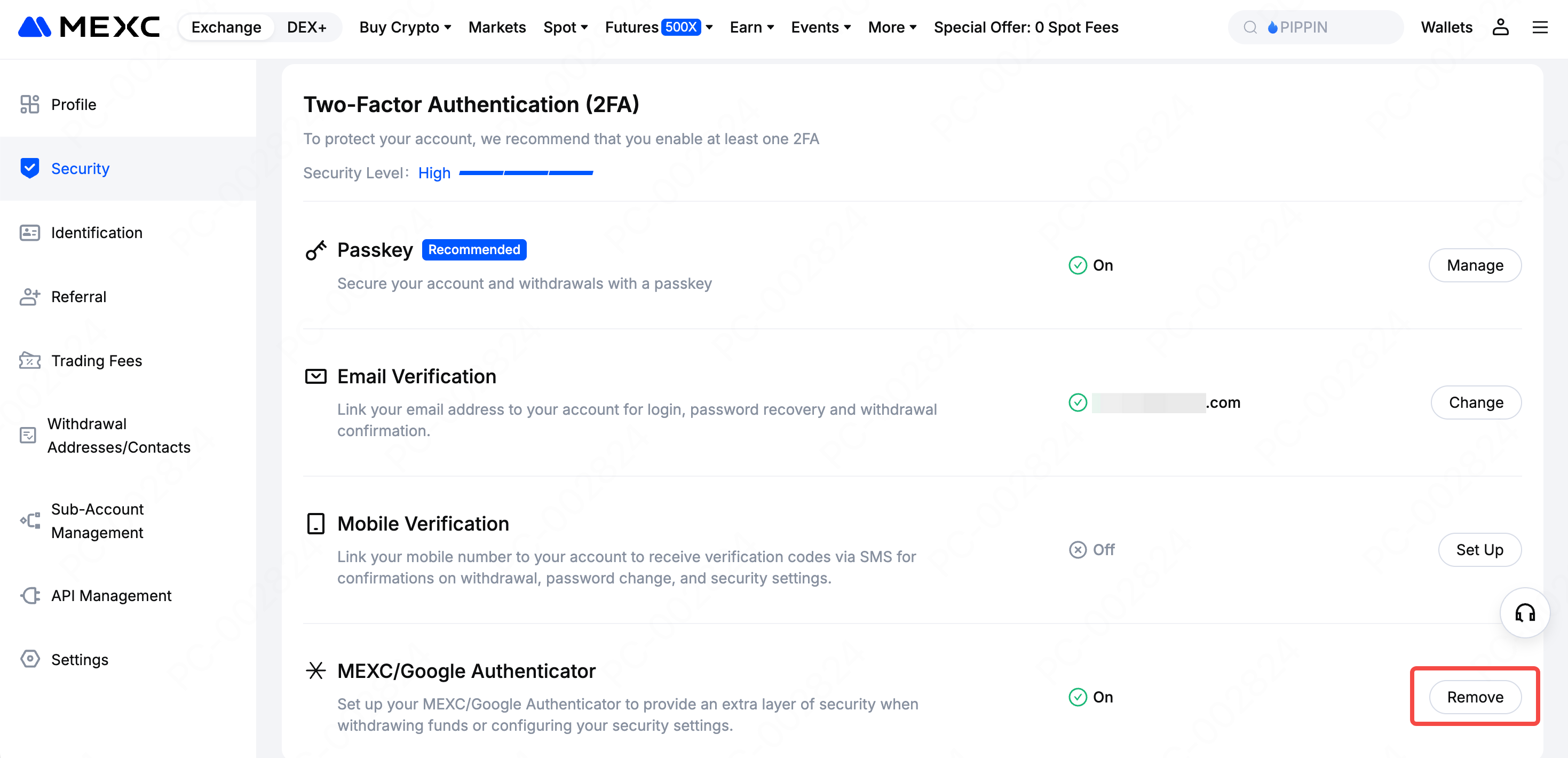 On the Security page, click Remove next to MEXC/Google Authenticator Code.