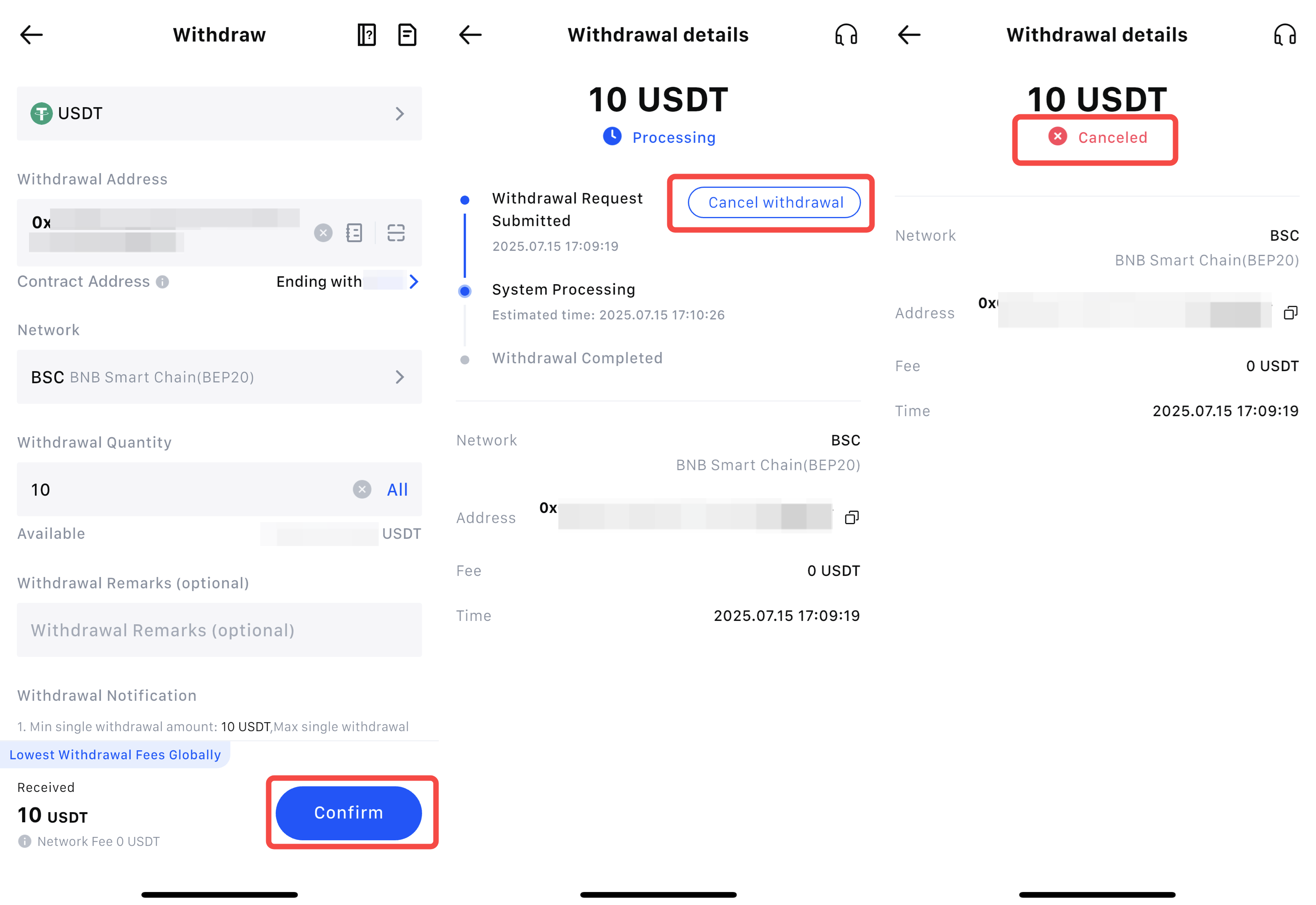 3) หากสถานะการถอนของคุณแสดงเป็น รอการยืนยันบล็อคเชน, รอการยืนยันบล็อค หรือ การถอนสำเร็จ จะไม่สามารถยกเลิกได้ เนื่องจากความไม่เปิดเผยตัวตนของที่อยู่บล็อคเชน เราจึงไม่สามารถติดตามผู้รับได้ ในกรณีเช่นนี้ คุณอาจต้องลองติดต่อเจ้าของที่อยู่ปลายทางผ่านช่องทางอื่นเพื่อแก้ไขปัญหา