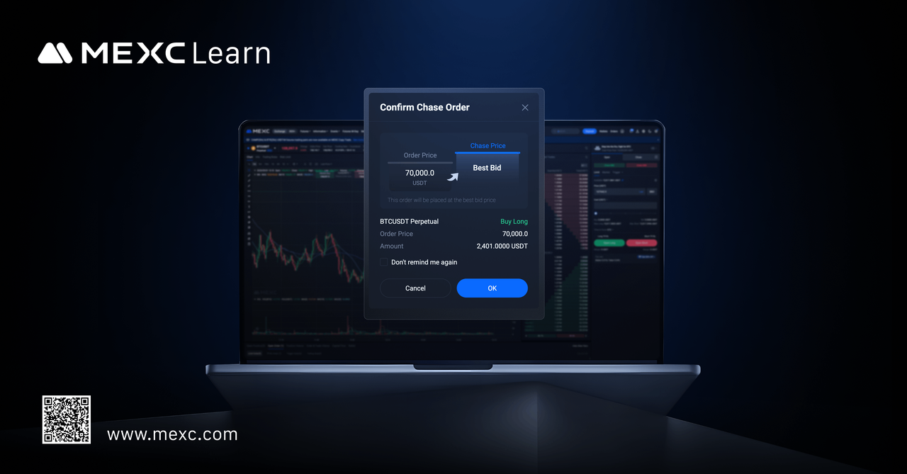 ฟังก์ชันการสั่งไล่ตามจะส่งคำสั่งจำกัดอีกครั้งในราคาตลาดที่ดีที่สุดในปัจจุบัน โดยเฉพาะอย่างยิ่ง เมื่อผู้ใช้เปิดใช้งานคำสั่งไล่ตาม MEXC ฟิวเจอร์ส คำสั่งจำกัดที่มีอยู่ซึ่งอยู่ไกลจากสมุดคำสั่งจะได้รับการปรับอย่างรวดเร็วให้เป็นคำสั่งเสนอซื้อหรือเสนอขายที่ดีที่สุด ในขณะที่ยังคงเป็นคำสั่งจำกัดในสมุดคำสั่ง วิธีนี้ช่วยให้ผู้ค้าสามารถคว้าโอกาสในช่วงที่ราคาเปลี่ยนแปลงอย่างรวดเร็ว โดยไม่ต้องพึ่งคำสั่งเทรดตามตลาด ซึ่งโดยทั่วไปจะมีค่าธรรมเนียมที่สูงกว่า