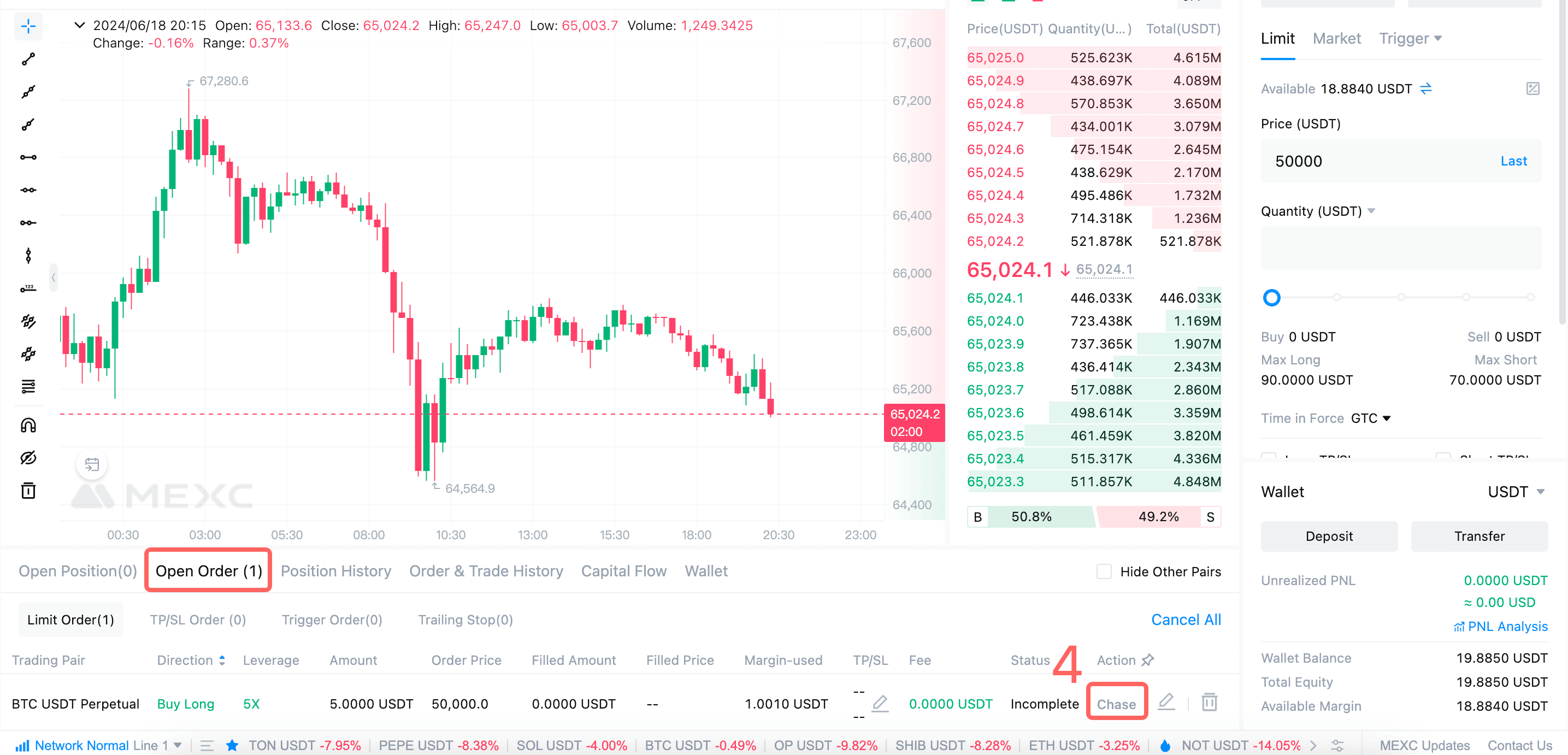 เปิดเว็บไซต์ MEXC อย่างเป็นทางการและเข้าสู่ระบบบัญชีของคุณ ภายใต้สัญญาฟิวเจอร์ส ให้เลือก USDT-M เพอร์เพทชวลฟิวเจอร์ส เพื่อเข้าสู่หน้าการเทรด ในแผงการวางคำสั่งซื้อทางด้านขวามือ ให้สร้างคำสั่งจำกัด