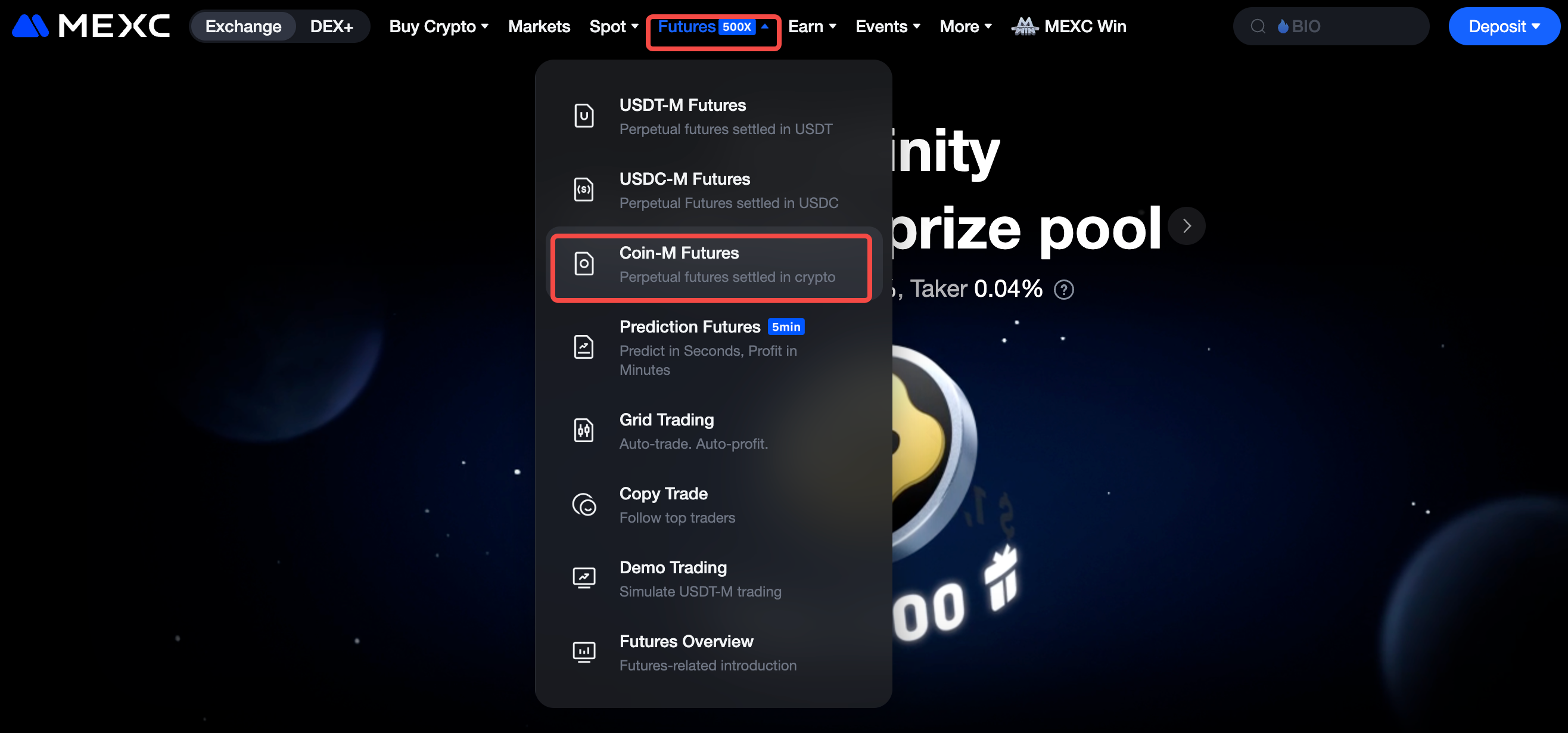 Coin-M ฟิวเจอร์ส ใช้ USD เป็นสกุลเงินอ้างอิง ในขณะที่กำไรและขาดทุนจะได้รับการชำระในสกุลเงินดิจิทัลพื้นฐาน ปัจจุบัน MEXC นำเสนอคู่ Coin-M ฟิวเจอร์ส หลายคู่ รวมถึง BTCUSD เพอร์เพทชวลฟิวเจอร์ส และ ETHUSD เพอร์เพทชวลฟิวเจอร์ส คู่ Coin-M ฟิวเจอร์ส แต่ละคู่จะมีมูลค่า USD คงที่ ตัวอย่างเช่น คู่ BTCUSD เพอร์เพทชวลฟิวเจอร์ส แต่ละคู่มีมูลค่า 100 ดอลลาร์ และคู่ ETHUSD เพอร์เพทชวลฟิวเจอร์ส แต่ละคู่มีมูลค่า 10 ดอลลาร์
