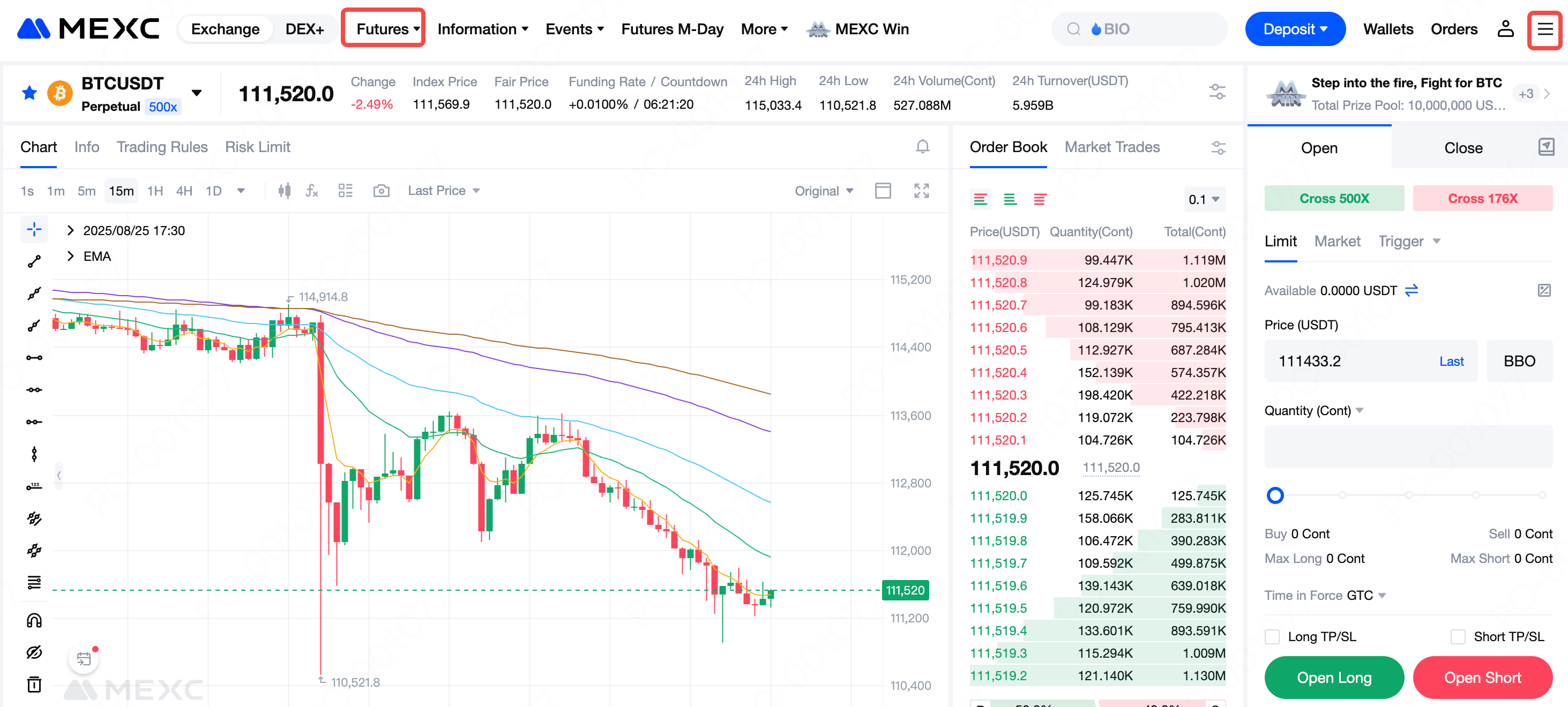 เข้าสู่ระบบเว็บไซต์ MEXC และเลือก USDT-M ฟิวเจอร์ส ภายใต้แท็บ ฟิวเจอร์ส ในแถบนำทางด้านบนเพื่อเข้าสู่หน้าการเทรด คลิกปุ่มการตั้งค่าที่มุมขวาบนของหน้า