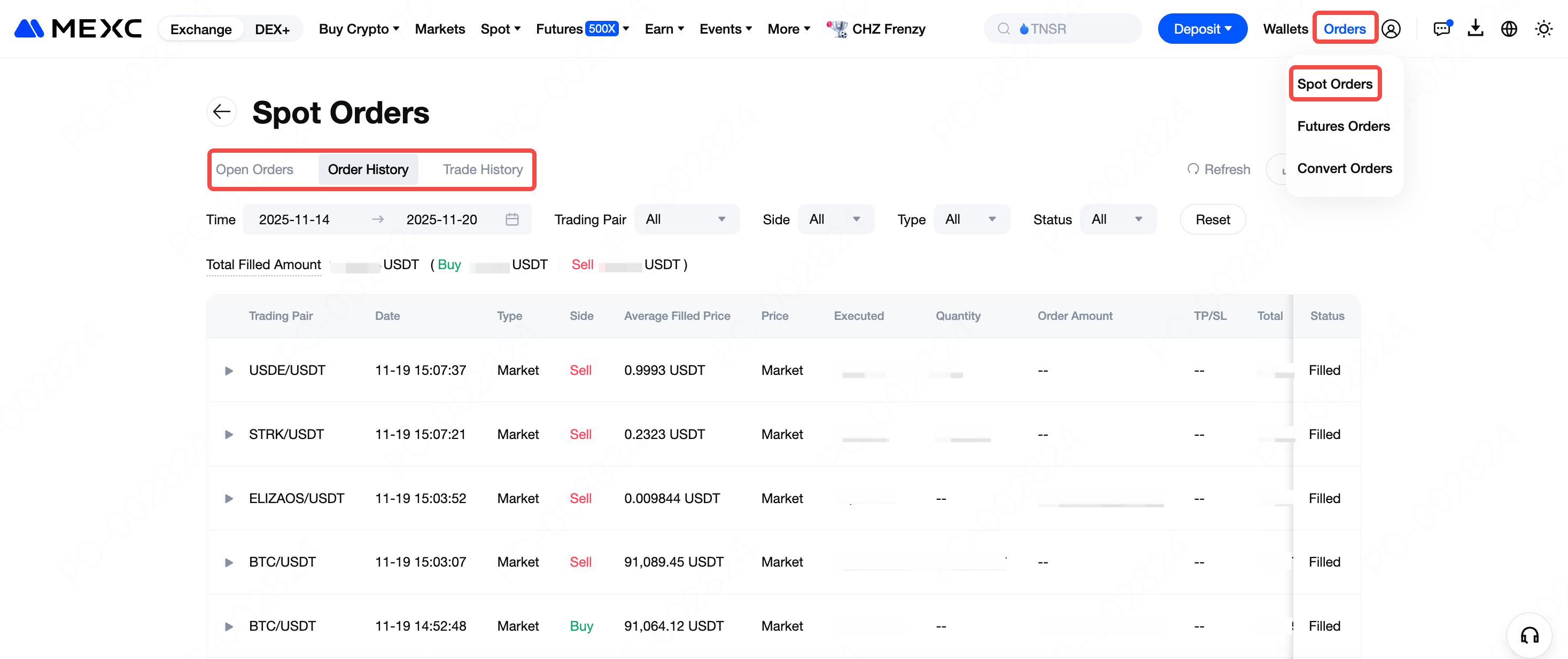 คุณสามารถตรวจสอบคำสั่งซื้อของคุณได้ในหน้า คำสั่งสปอต เช่นกัน ในแถบนำทาง ให้คลิก คำสั่ง → คำสั่งสปอต จากนั้นดูคำสั่งซื้อของคุณได้ในหัวข้อ คำสั่งเปิด, ประวัติคำสั่ง หรือ ประวัติการเทรด ในหน้าคำสั่งสปอต