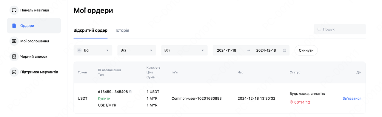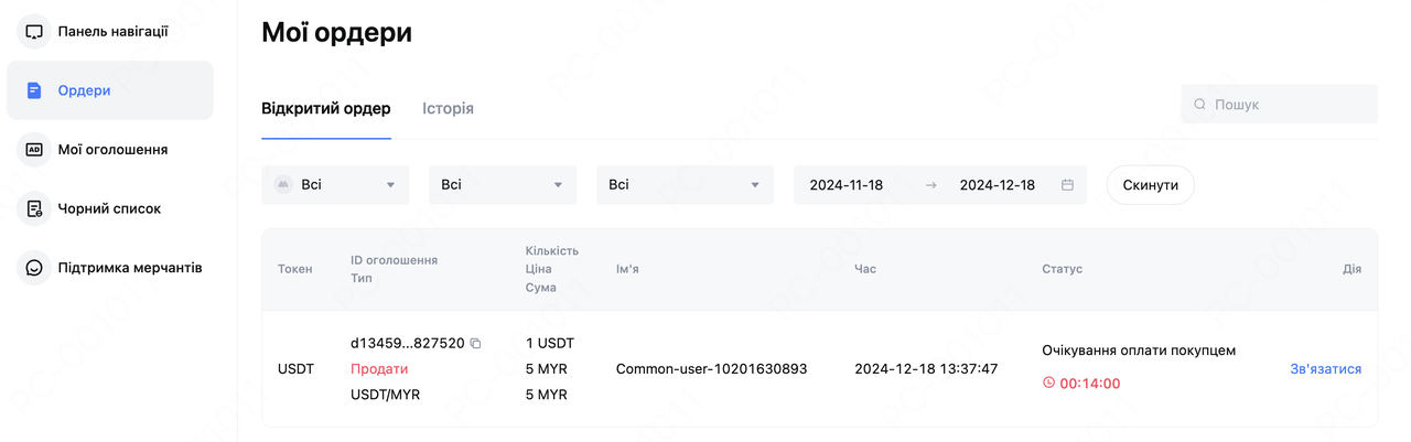 Коли користувач погодиться на ваше оголошення, ви отримаєте сповіщення різними каналами. Ви також можете знайти ордер у вкладці "Відкритий ордер".
