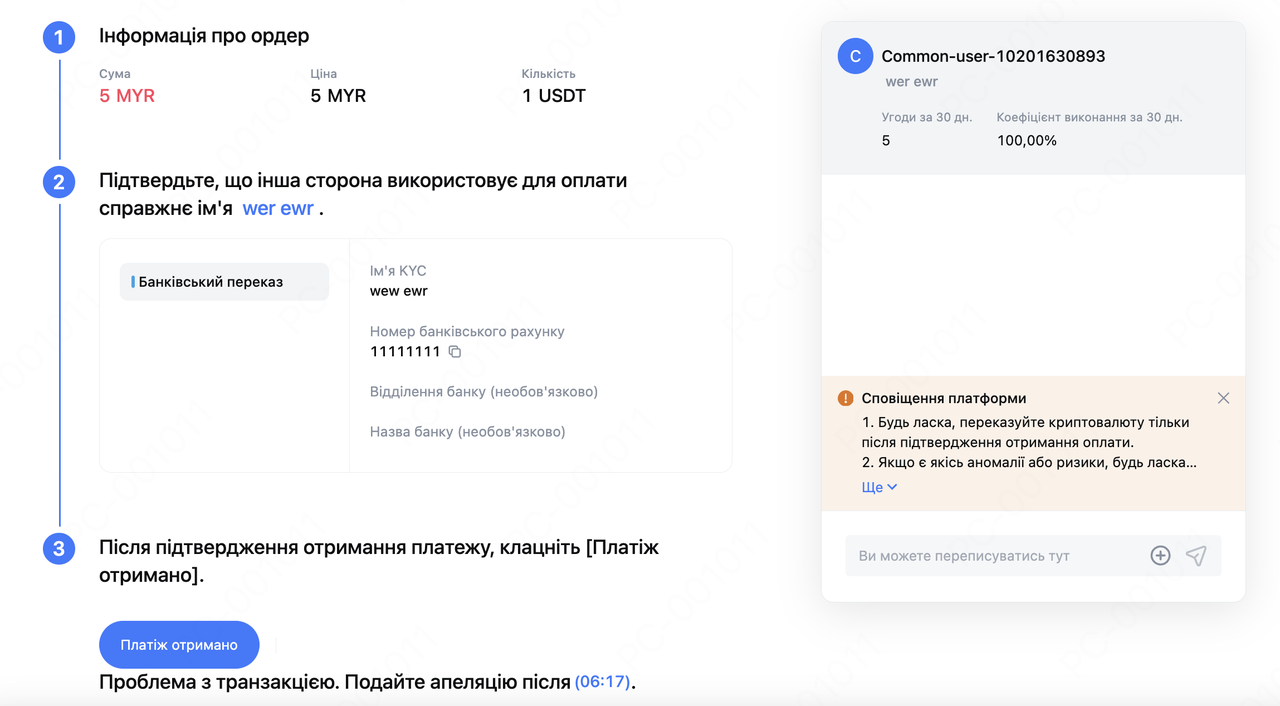 Після того, як покупець клацне [Переказ завершено], ви зможете перевірити, чи отримали ви платіж на свій банківський рахунок. Не переказуйте криптовалюту, поки платіж не буде підтверджено. Клацніть [Платіж отримано] після підтвердження його отримання.