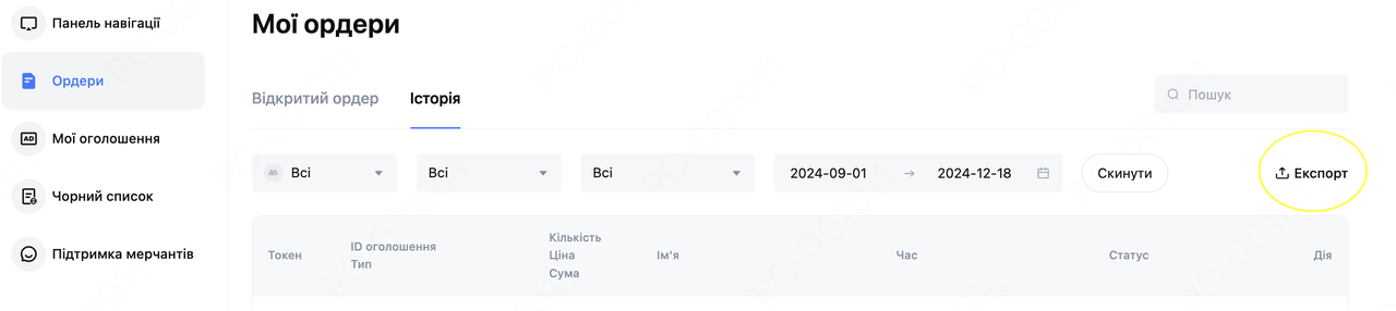 Ви також можете знайти минулі ордери на панелі навігації мерчанта - [Ордери] - [Історія]. Виберіть дату та експортуйте квитанцію про ордер.