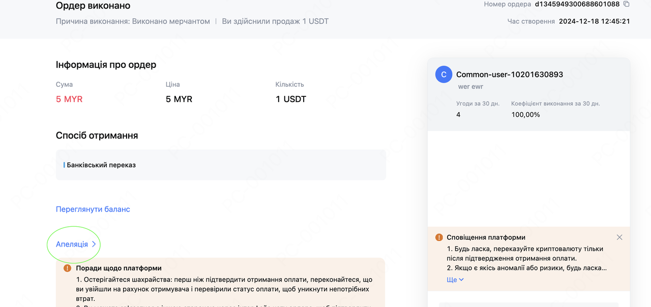 Або ви можете клацнути кнопку [Апеляція] на сторінці деталей ордера.