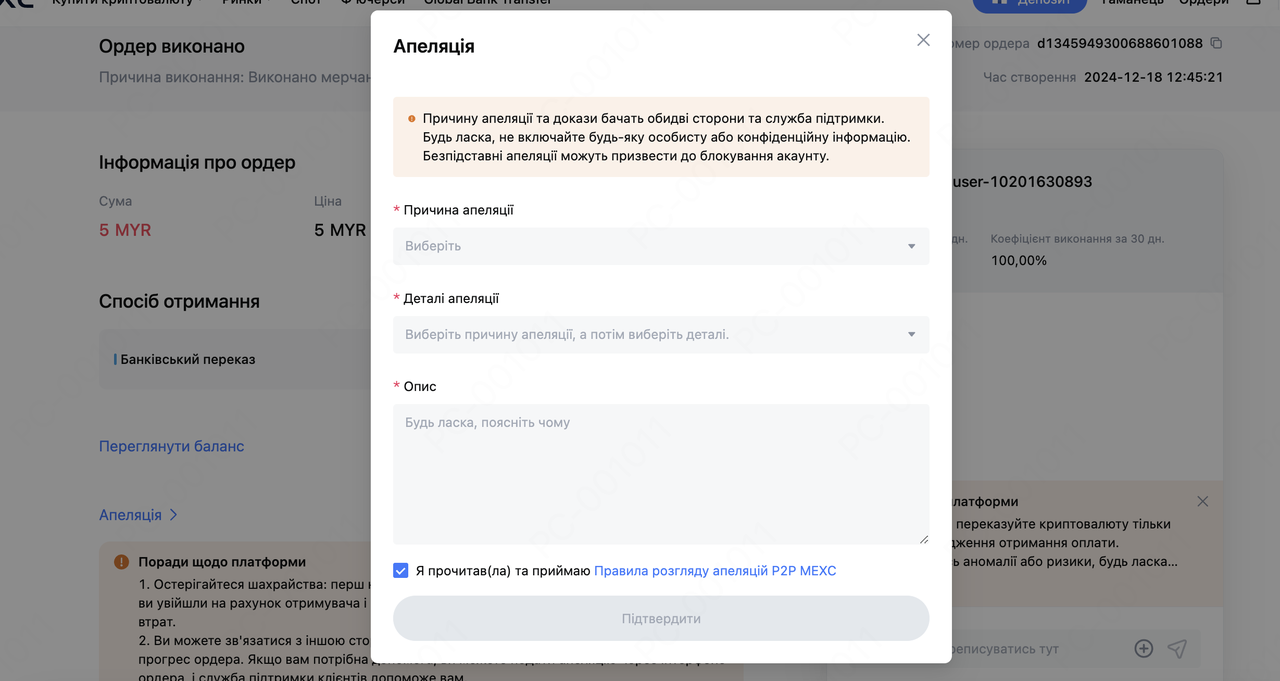 Виберіть причину апеляції. Коротко опишіть проблему та завантажте відповідні скриншоти, документи тощо. Клацніть [Підтвердити], щоб надіслати апеляцію.