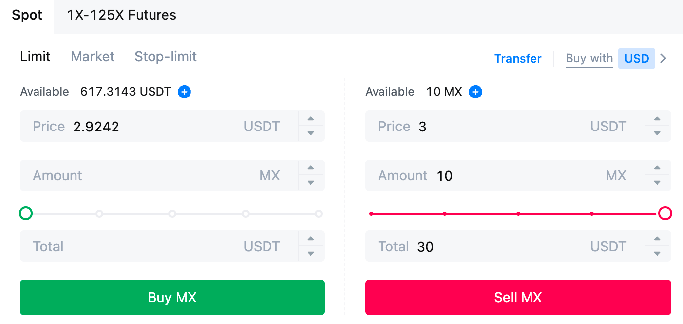 Важливо зазначити, що коли ринкові ціни дуже волатильні, використання маркет ордера може призвести до того, що кінцева ціна виконання буде відрізнятися від початкової ціни, показаної користувачеві. Наприклад, якщо поточна ціна MX становить 2,94 USDT, і ви розміщуєте маркет ордер на 294 USDT для купівлі 100 токенів MX, ціна може коливатися між моментом, коли ви клацнули на кнопку купівлі, і моментом виконання ордера, в результаті чого фактична кількість токенів MX буде відрізнятися від 100.