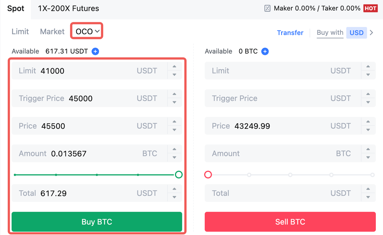 Ордери OCO мають на меті забезпечити вигіднішу ціну виконання та гарантувати виконання купівлі/продажу. У спотовій торгівлі інвестори можуть використовувати цю торгову стратегію, коли хочуть одночасно встановити стоп-лімітний ордер і лімітний ордер.