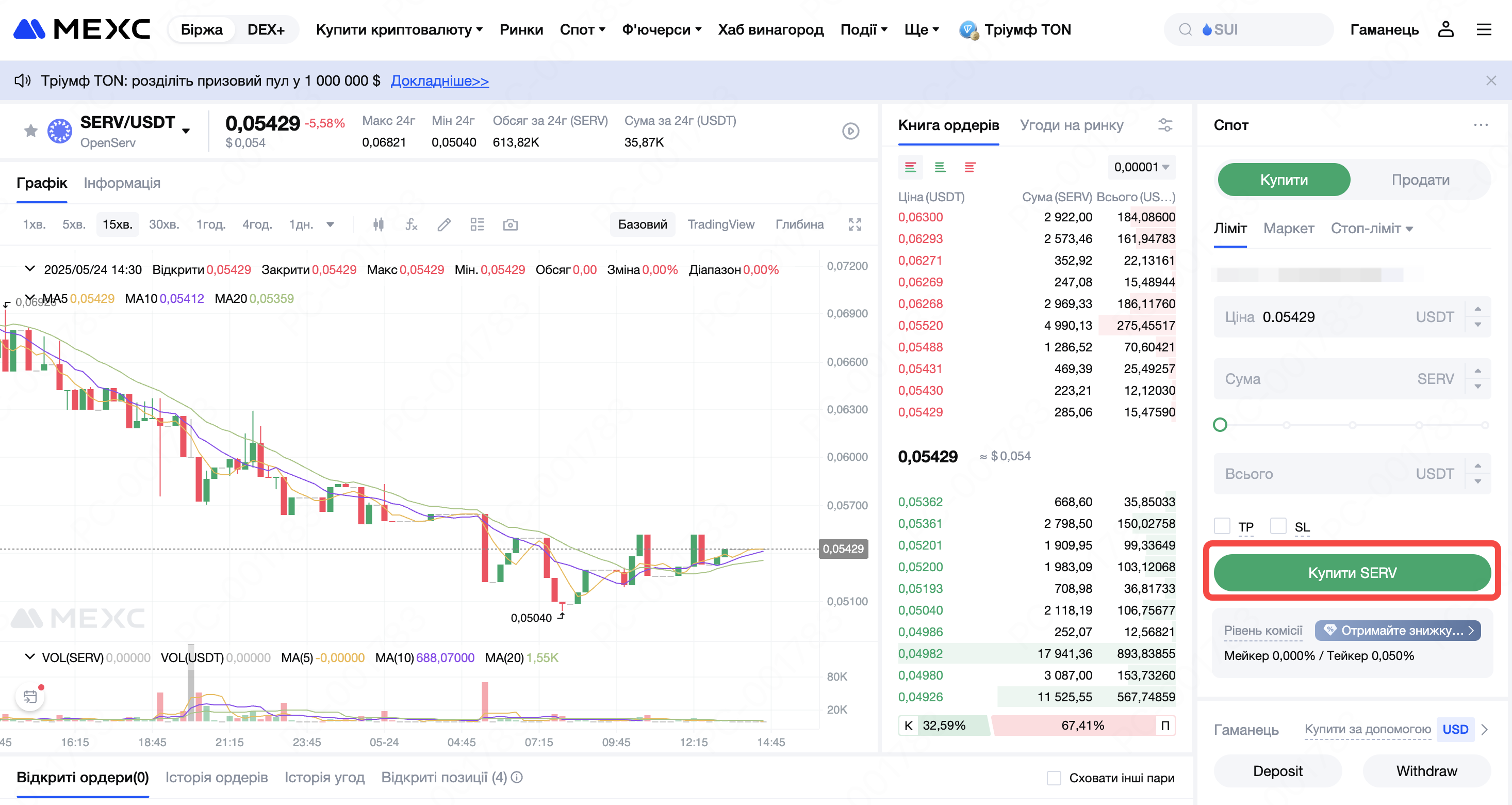 SERV є одним з найпопулярніших токенів на сьогодні, і платформа MEXC скористалася своєю перевагою першопрохідця, щоб здійснити лістинг токена на своїй платформі. Ви можете торгувати SERV на MEXC, виконавши такі кроки: