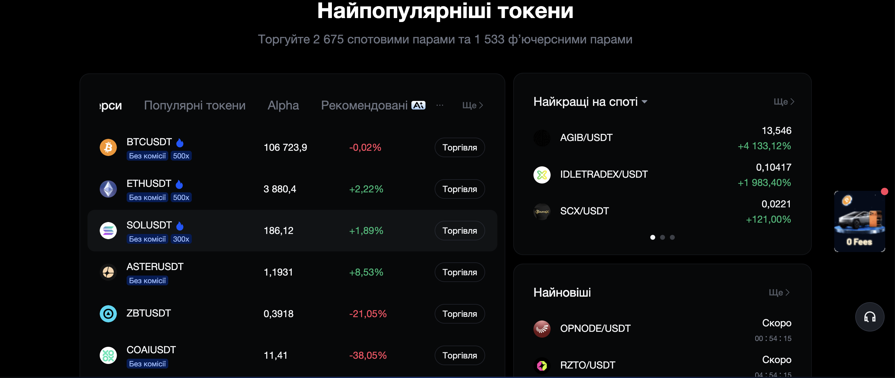 Станом на 14 жовтня 2025 року на MEXC проведено лістинг понад 2674 спотових пар і 1525 ф'ючерсних пар, охоплюючи все — від основних до трендових токенів, значно перевищуючи середній показник у галузі. Це всеосяжне покриття походить від унікальної екосистеми MEXC, яка працює на основі децентралізованої системи агрегації MEXC DEX+ і MEXC Alpha, що швидко виявляє нові якісні проєкти, скорочує цикл прийняття рішень щодо лістингу й уможливлює гнучкіше реагування ринку. Як наслідок, як трейдери-початківці, так і досвідчені трейдери можуть знайти на MEXC відповідні інвестиційні цілі, диверсифікувати свої портфелі, зменшити ризики й оптимізувати розподіл активів.