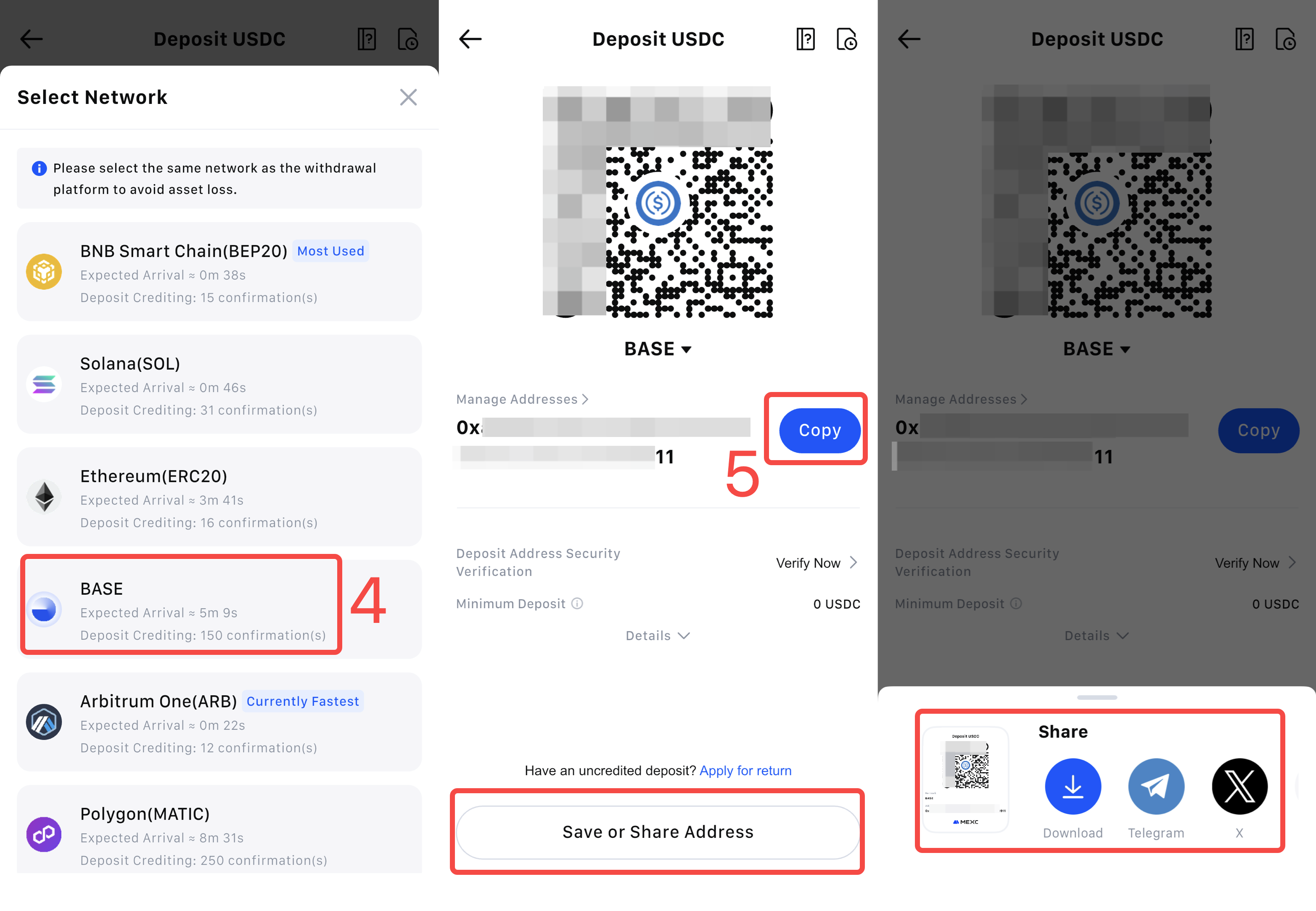 Різні мережі мають різні комісії та час підтвердження. Виберіть варіант, який найкраще відповідає вашим потребам. У цьому прикладі ми вибрали мережу Base і торкнулись позначки BASE, щоб продовжити.