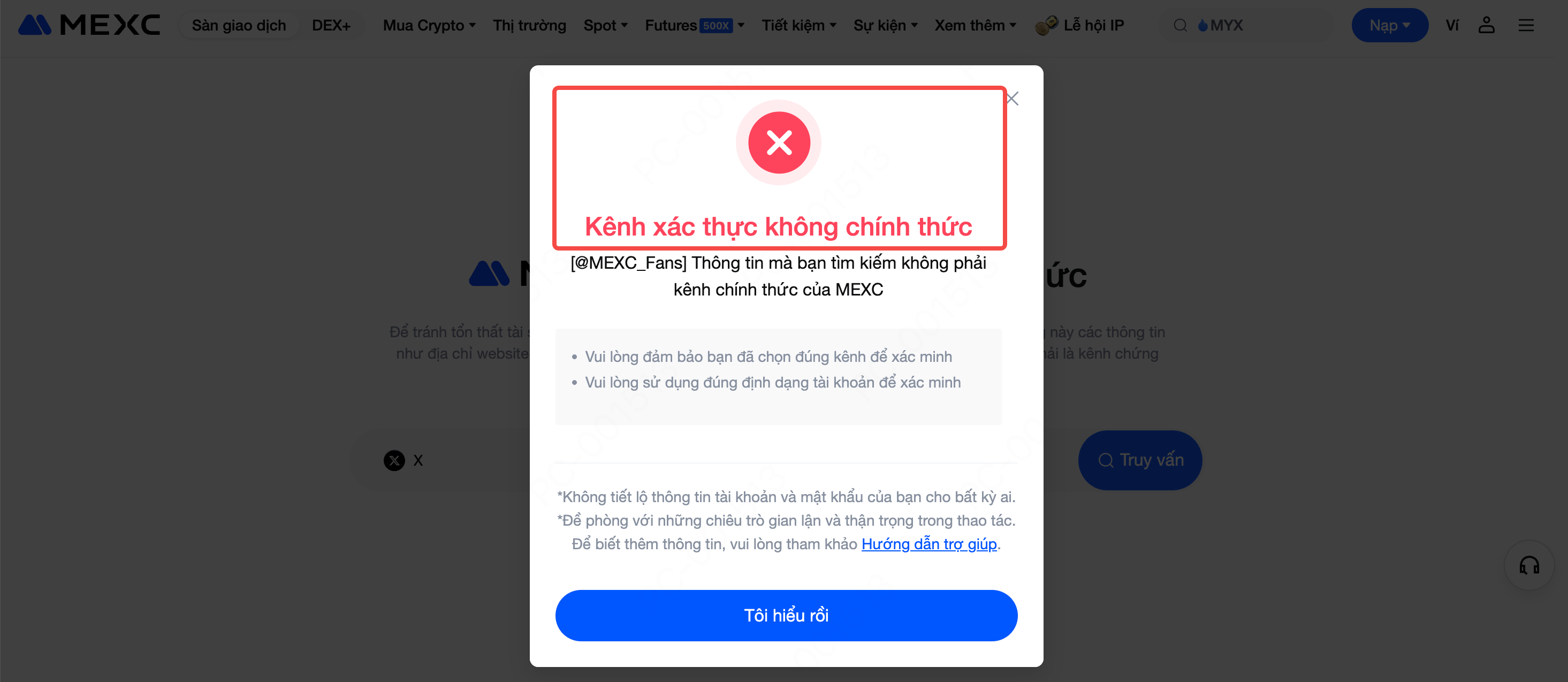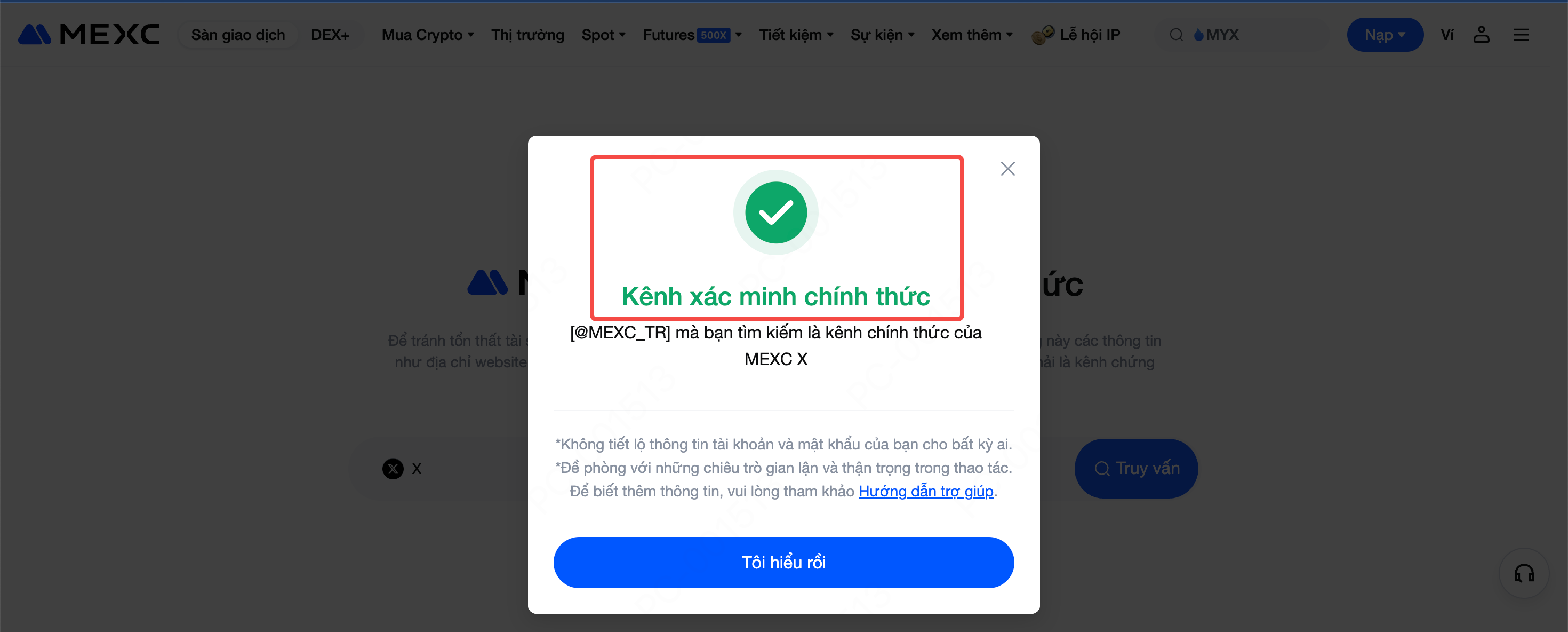Phương thức xác minh chính thức do MEXC cung cấp có thể xác nhận chính xác liệu ID tài khoản bạn nhập có thuộc tài khoản chính thức hay không. Tuy nhiên, vui lòng lưu ý một số kẻ lừa đảo có thể sao chép đúng ID tài khoản chính thức và cài đặt vào phần mô tả hồ sơ của một tài khoản giả mạo. Do đó, khi xác minh một tài khoản mạng xã hội có phải là chính thức hay không, vui lòng đảm bảo bạn đang sao chép đúng ID tài khoản thực tế.
