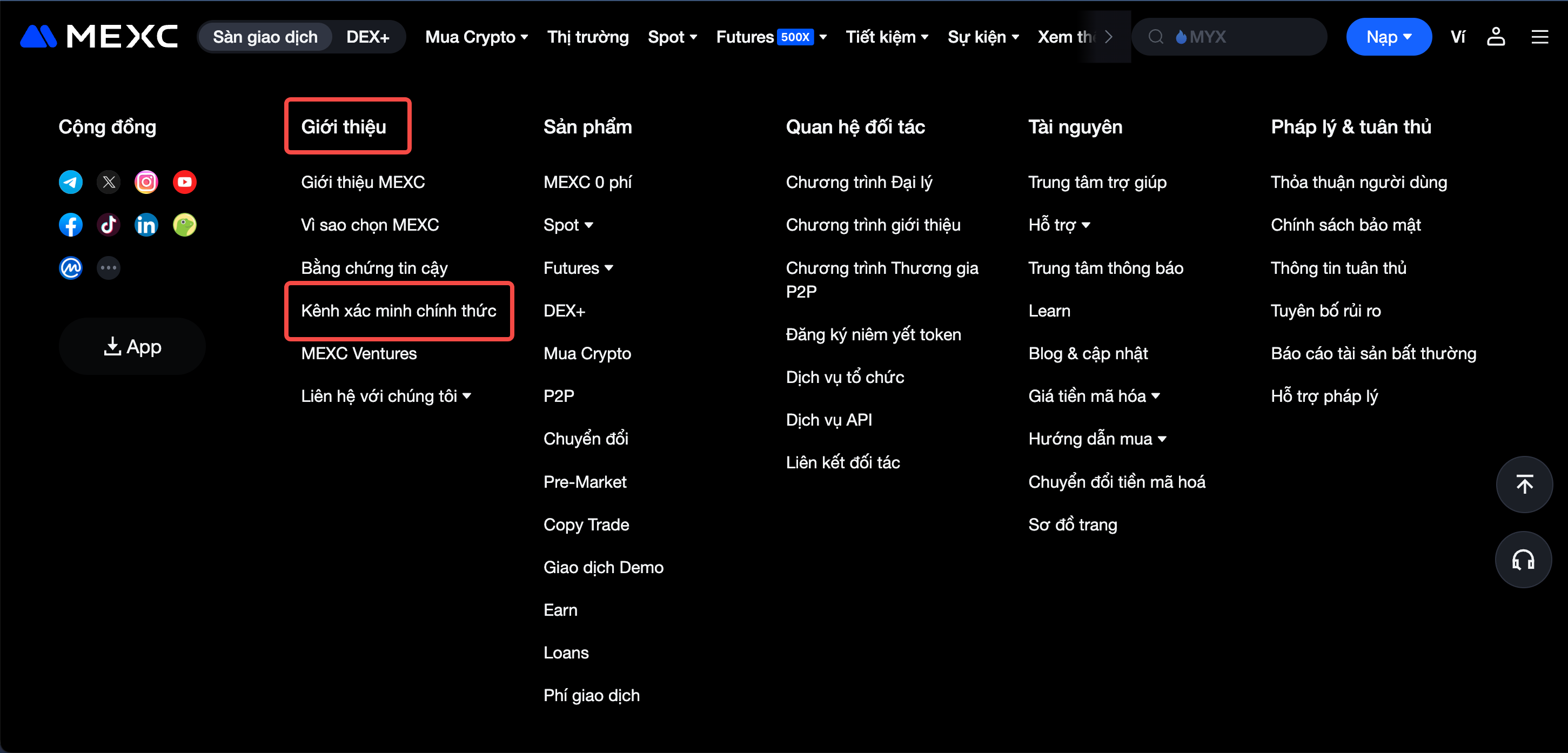 Truy cập trang web chính thức của MEXC, kéo xuống cuối trang chủ và nhấn vào Kênh xác minh chính thức trong mục Giới thiệu để truy cập trang xác minh.