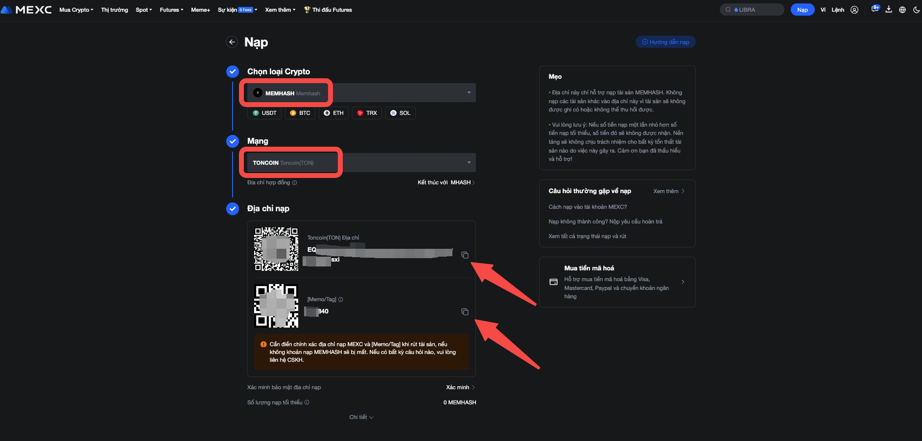 - Truy cập [Ví] > [Nạp] > [Chọn loại Crypto - MEMHASH] > [Mạng - TONCOIN] > Sao chép địa chỉ nạp và Memo.