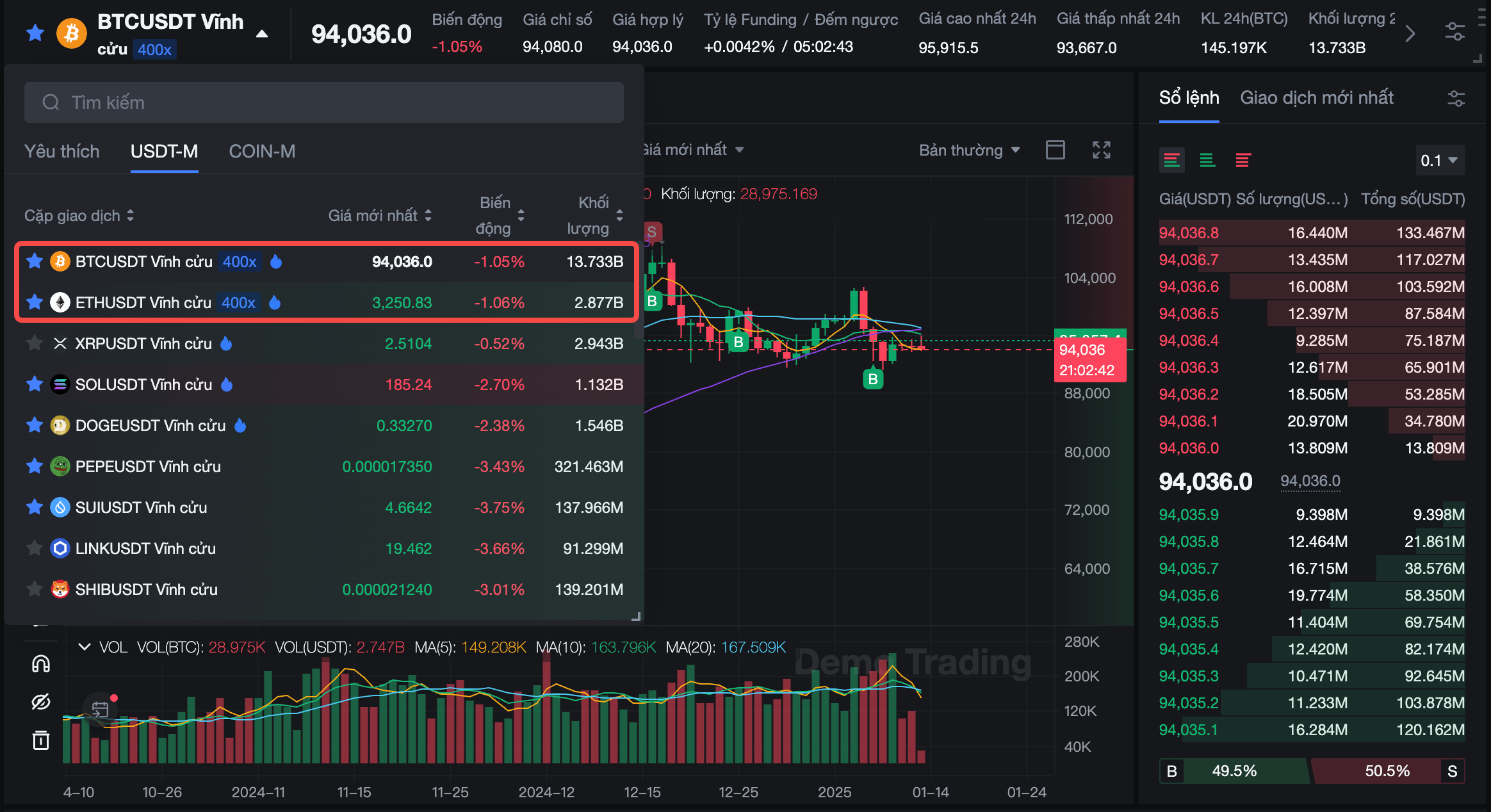 Bước 2: Chọn cặp Futures hỗ trợ đòn bẩy 400x. Các cặp hiện được hỗ trợ là BTCUSDT và ETHUSDT.