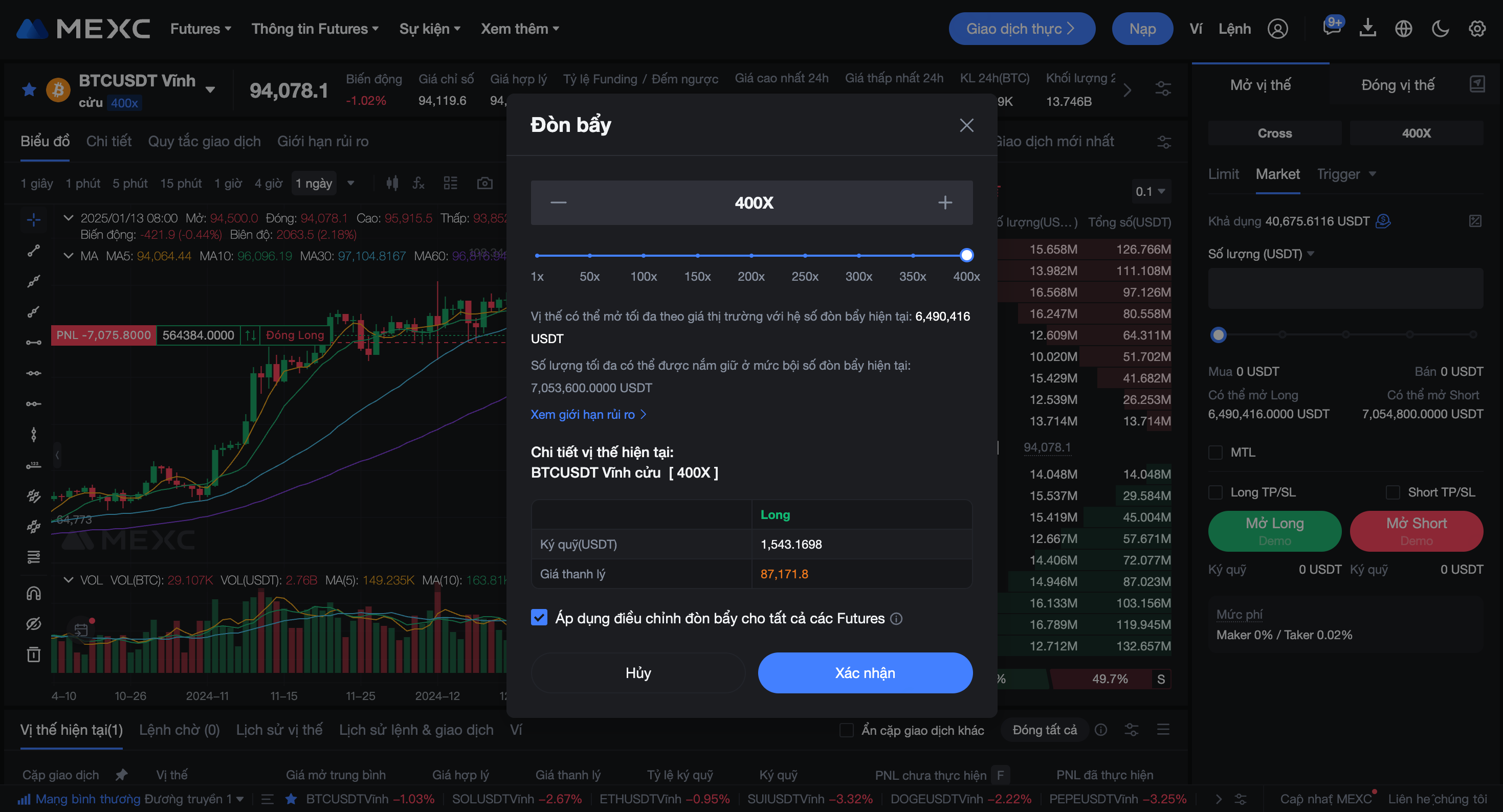 Chúng tôi hân hạnh ra mắt tính năng đột phá dành cho các nhà giao dịch Futures MEXC! Bạn hiện có thể tận dụng đòn bẩy lên đến 400x cho BTCUSDT và ETHUSDT Futures, giúp phát huy khả năng nắm bắt xu hướng thị trường và nâng tầm chiến lược giao dịch.