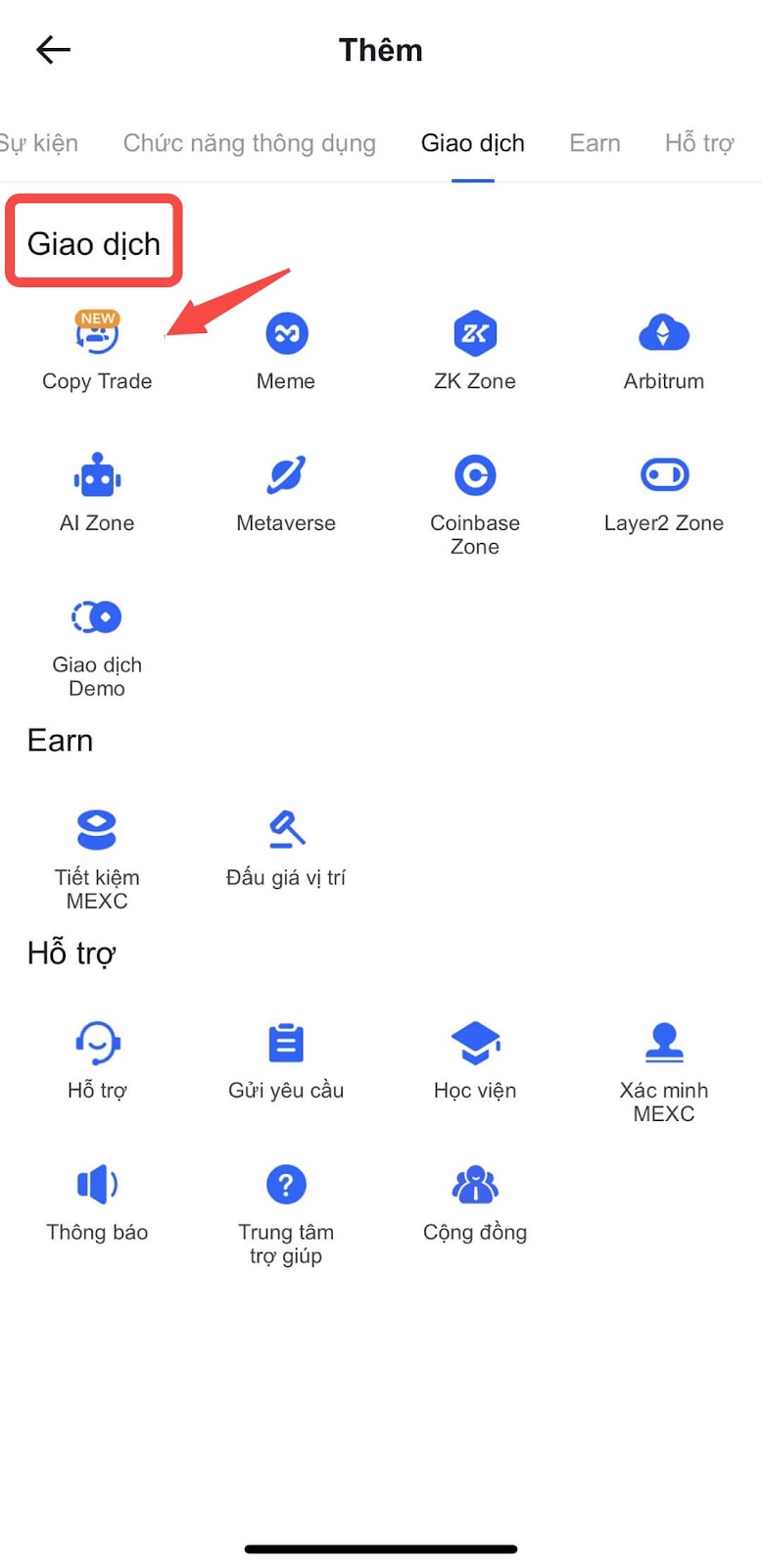 Truy cập Copy Trade:APP> Thêm> Giao dịch> Copy Trade