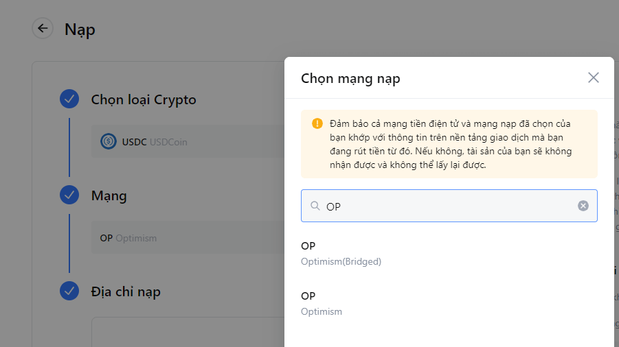 - Trên trang Nạp/Rút, tên mạng của USD Coin (USDC) trên mạng Optimism sẽ được hiển thị là Optimism. Vui lòng xác nhận trước khi gửi/rút tiền để tránh mọi tổn thất về tài sản.