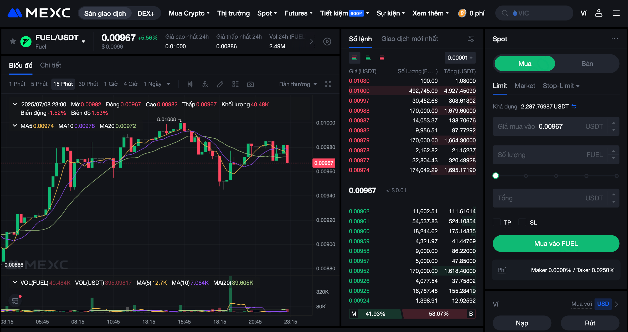 2) Tại thanh tìm kiếm, nhập "FUEL" và chọn cặp Spot. 3) Chọn loại lệnh, nhập số lượng và giá, sau đó hoàn thành giao dịch.