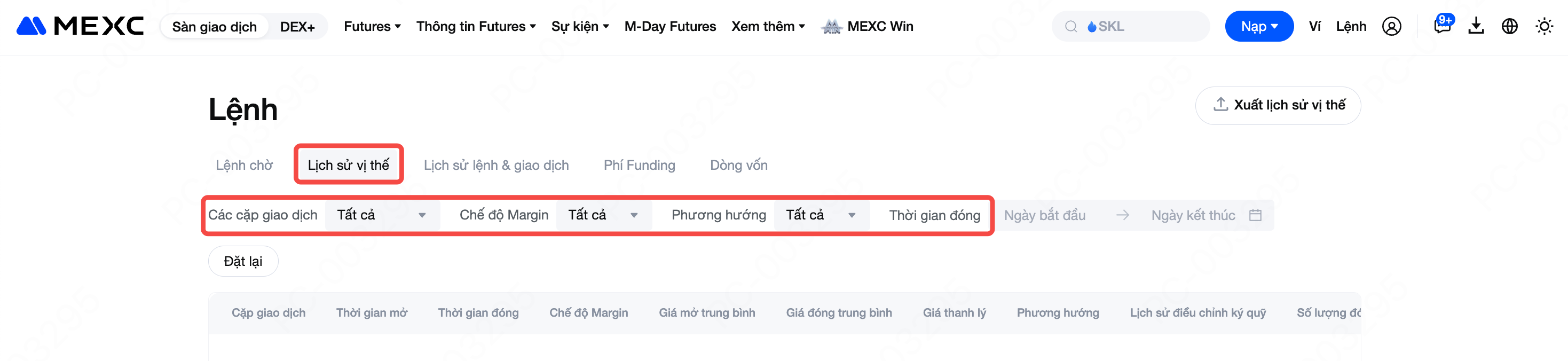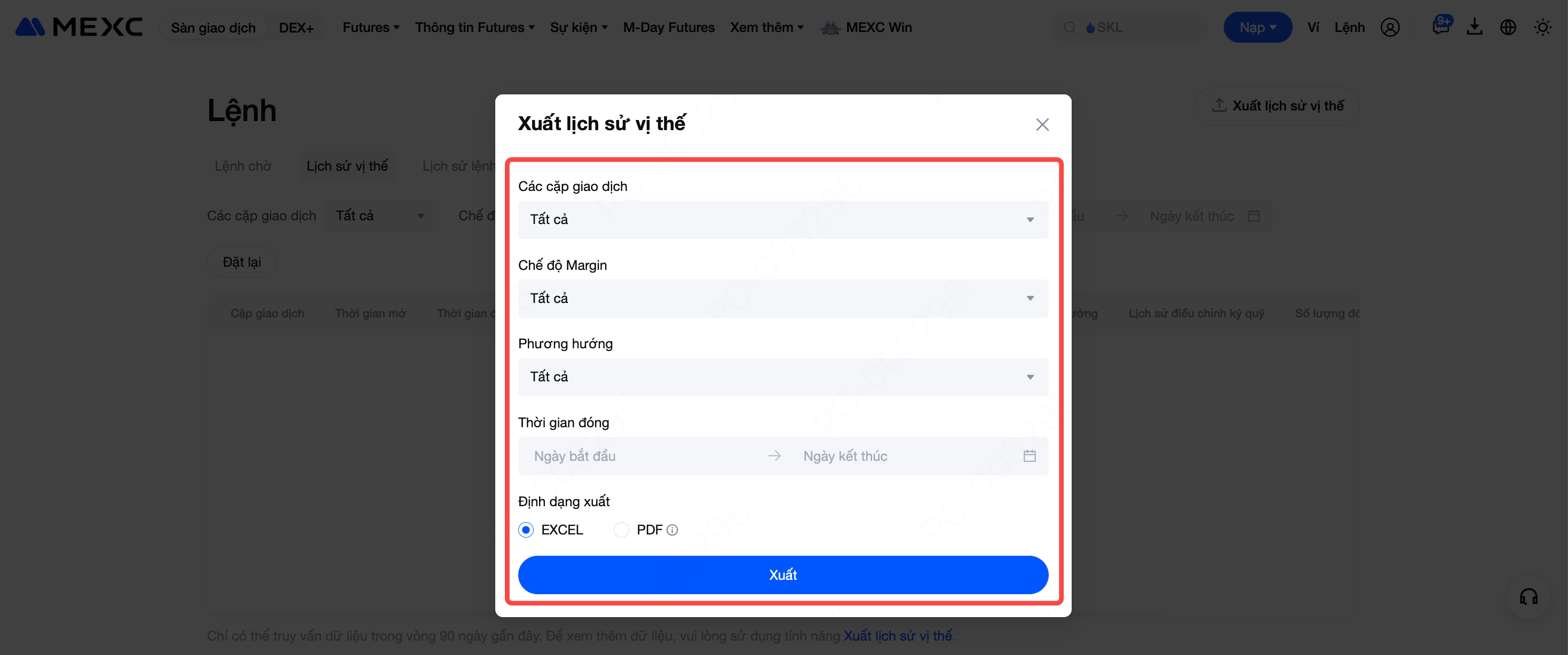 Hiện tại, MEXC chỉ hỗ trợ xuất dữ liệu lịch sử vị thế Futures trên web, tính năng này chưa khả dụng trên App.