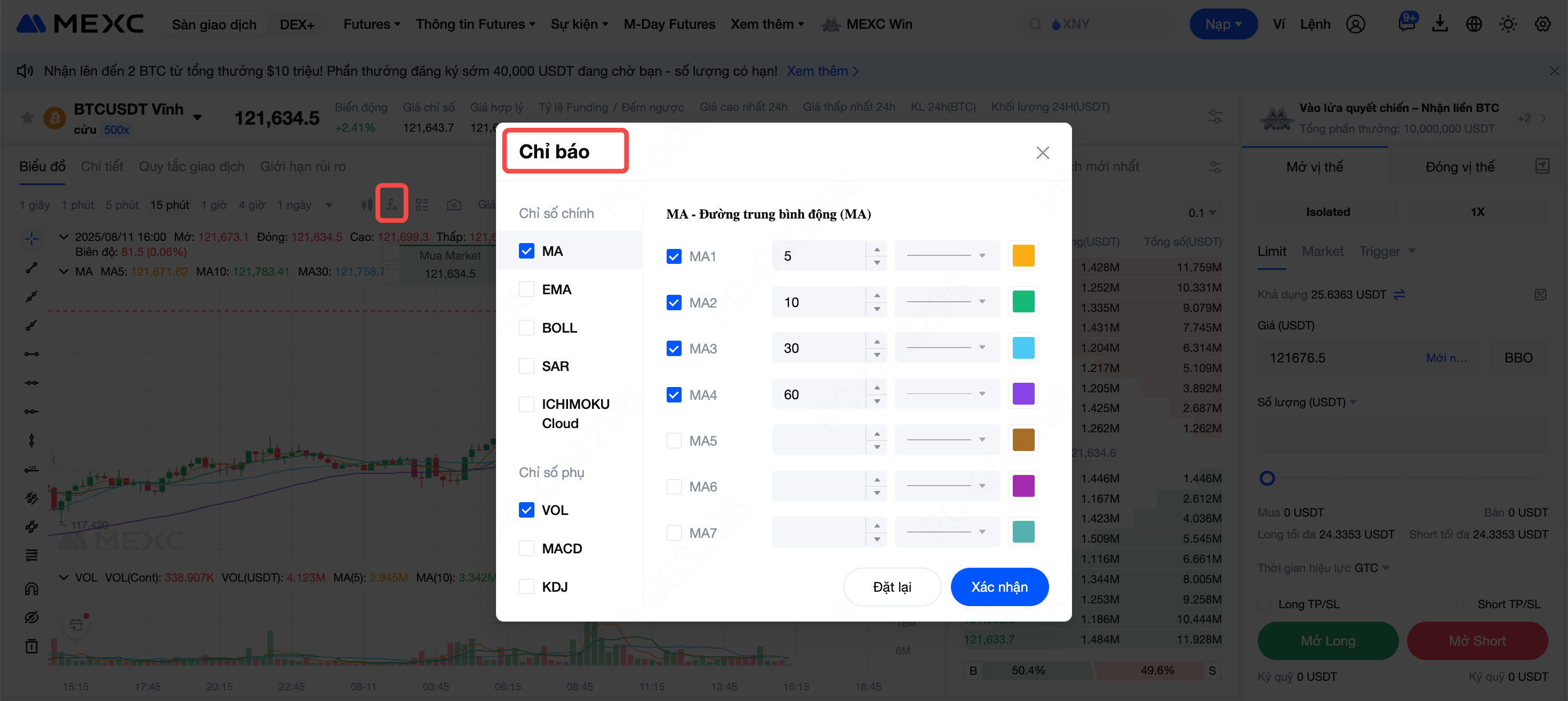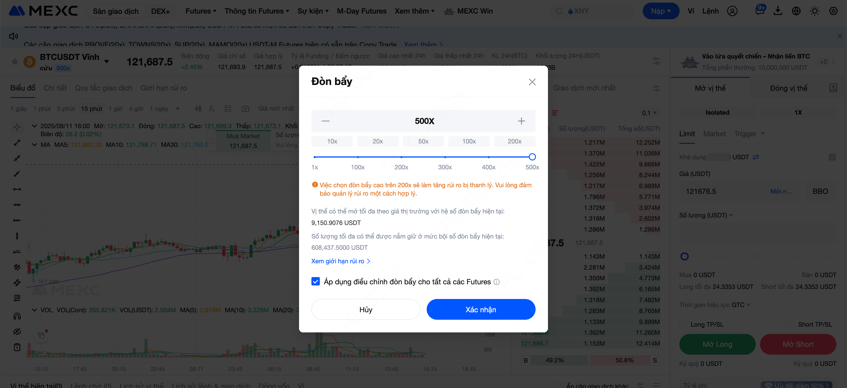 Các cặp giao dịch khác nhau hỗ trợ mức đòn bẩy tối đa khác nhau. Khi chọn đòn bẩy, hãy đánh giá dựa trên khả năng chịu rủi ro cá nhân, kinh nghiệm giao dịch và mức biến động thị trường hiện tại. Người mới nên tránh dùng đòn bẩy quá cao và nên giữ ở mức có thể kiểm soát để giảm nguy cơ bị thanh lý. Ví dụ, trong giao dịch BTCUSDT, MEXC cung cấp đòn bẩy lên đến 500x. Tuy nhiên, đối với nhà giao dịch mới, bắt đầu với mức đòn bẩy thấp, như 2x hoặc 5x, sẽ giúp quá trình học tập diễn ra mượt mà hơn và hiểu rõ hành vi thị trường trước khi tăng mức tiếp xúc.