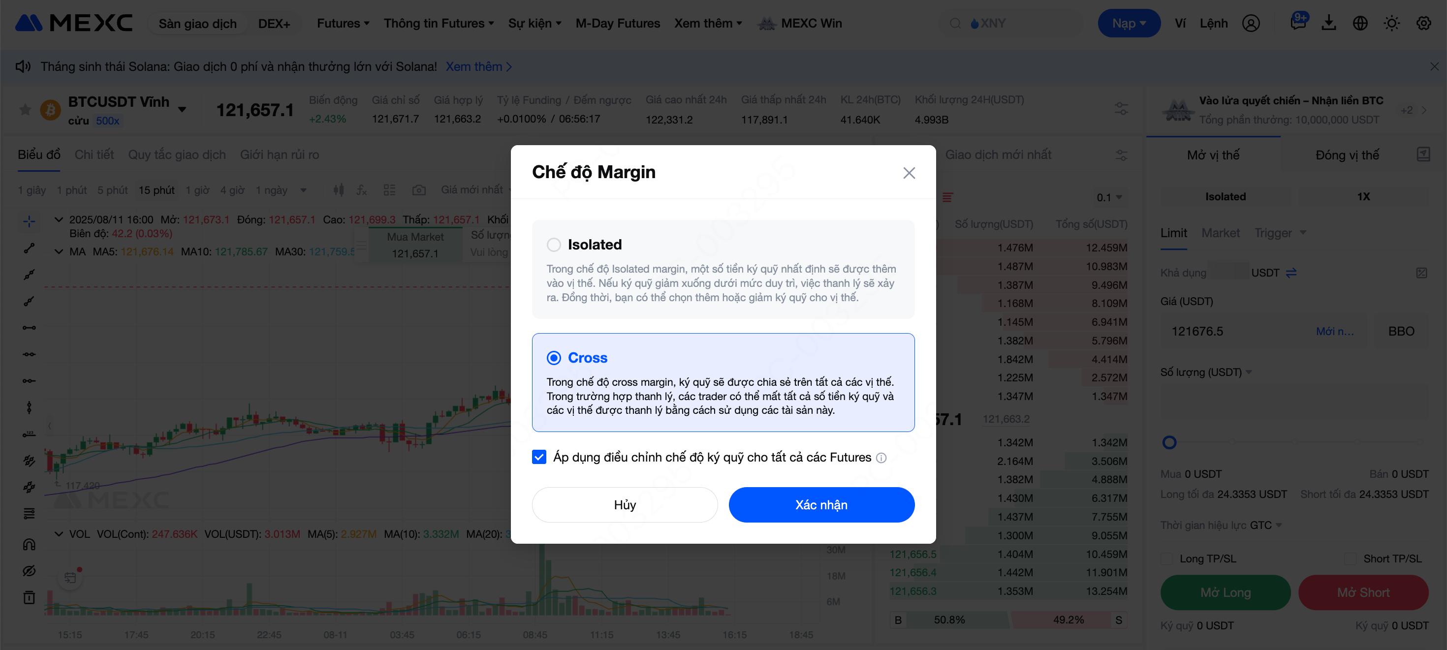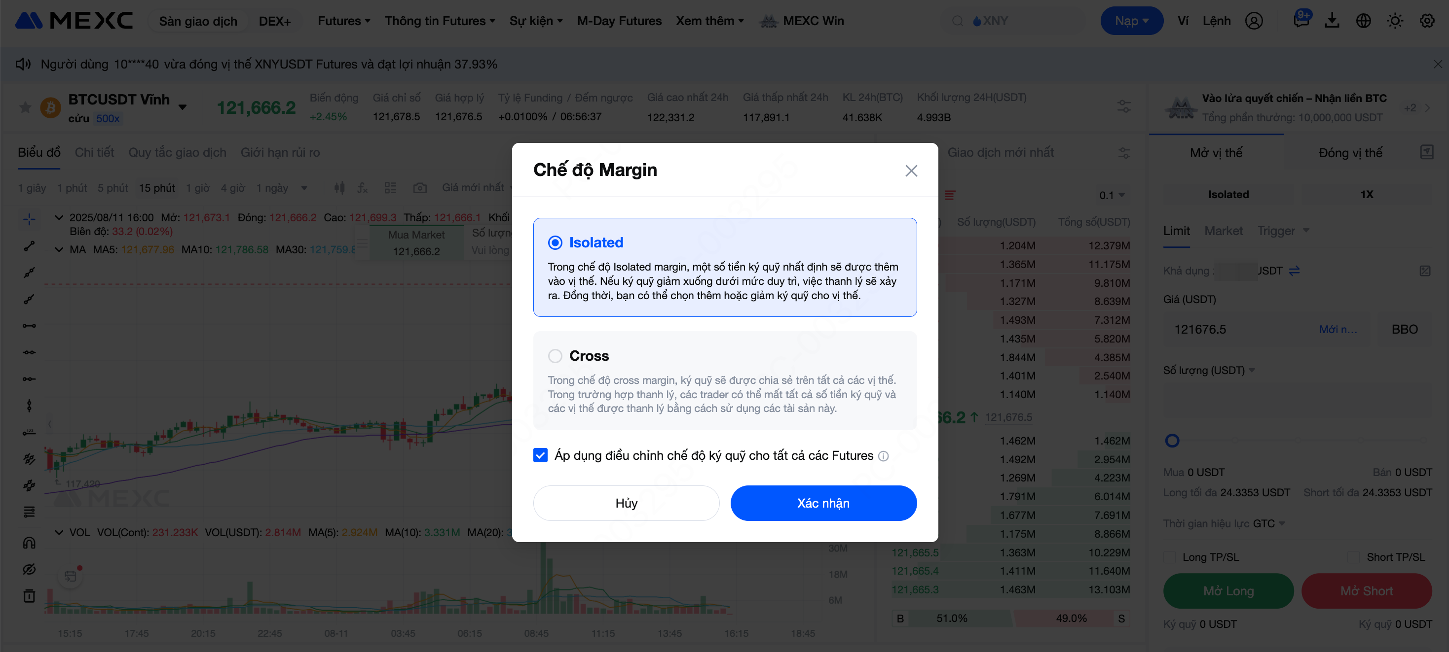 Isolated margin: Mỗi vị thế có ký quỹ và tính toán PNL riêng. Thua lỗ được giới hạn trong số ký quỹ đã phân bổ cho vị thế đó, mang lại khả năng kiểm soát rủi ro tốt hơn.