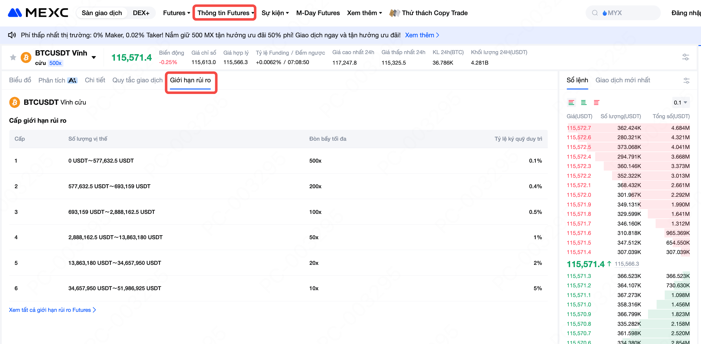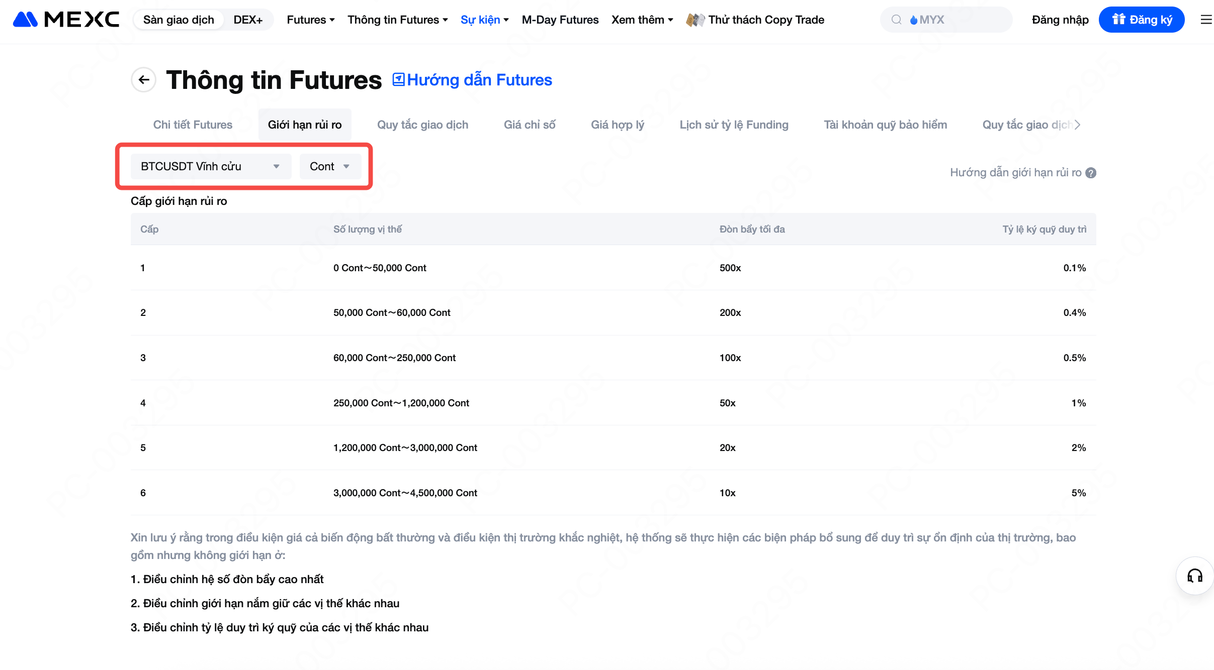 MEXC áp dụng giới hạn vị thế theo cấp dựa trên số lượng vị thế, nhằm ngăn thị trường bị ảnh hưởng quá mức bởi các vị thế lớn. Ví dụ: