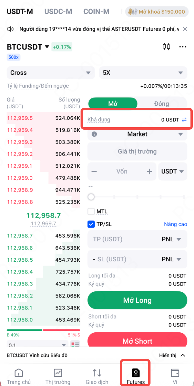 | Vốn chủ sở hữu tài khoản (USDT) | Hành động