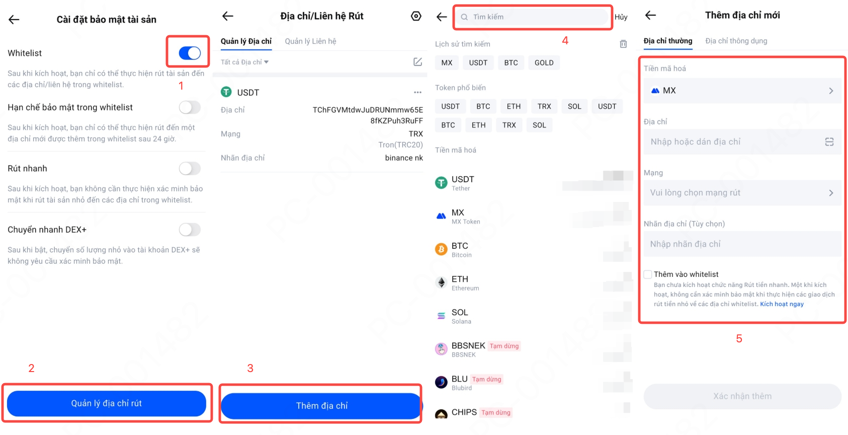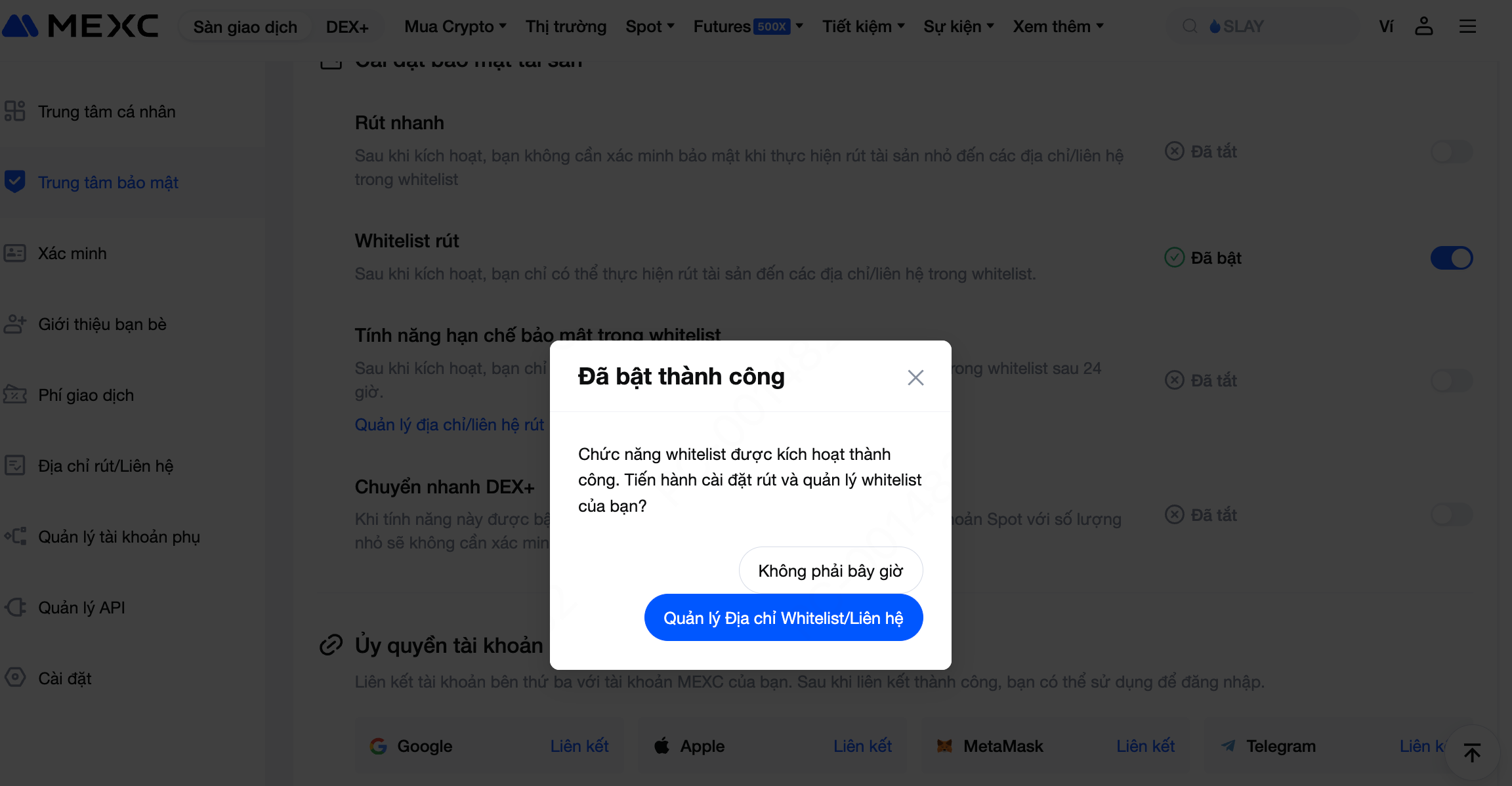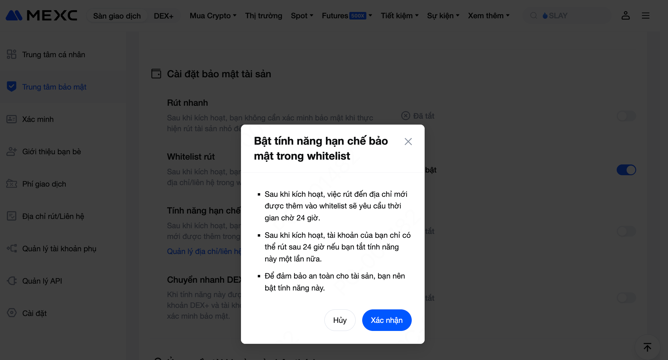 - Sau khi kích hoạt, việc rút đến địa chỉ mới được thêm vào whitelist sẽ yêu cầu thời gian chờ 24 giờ.