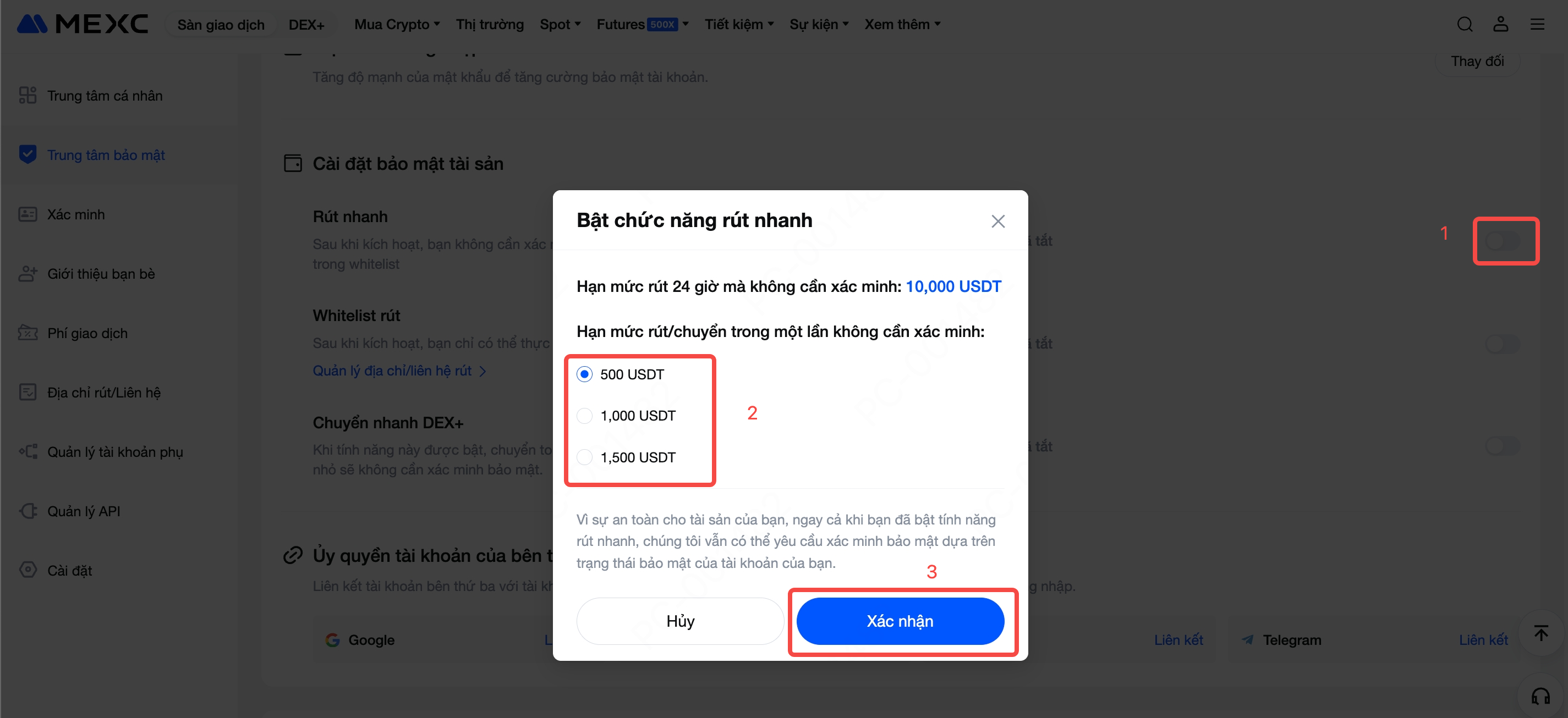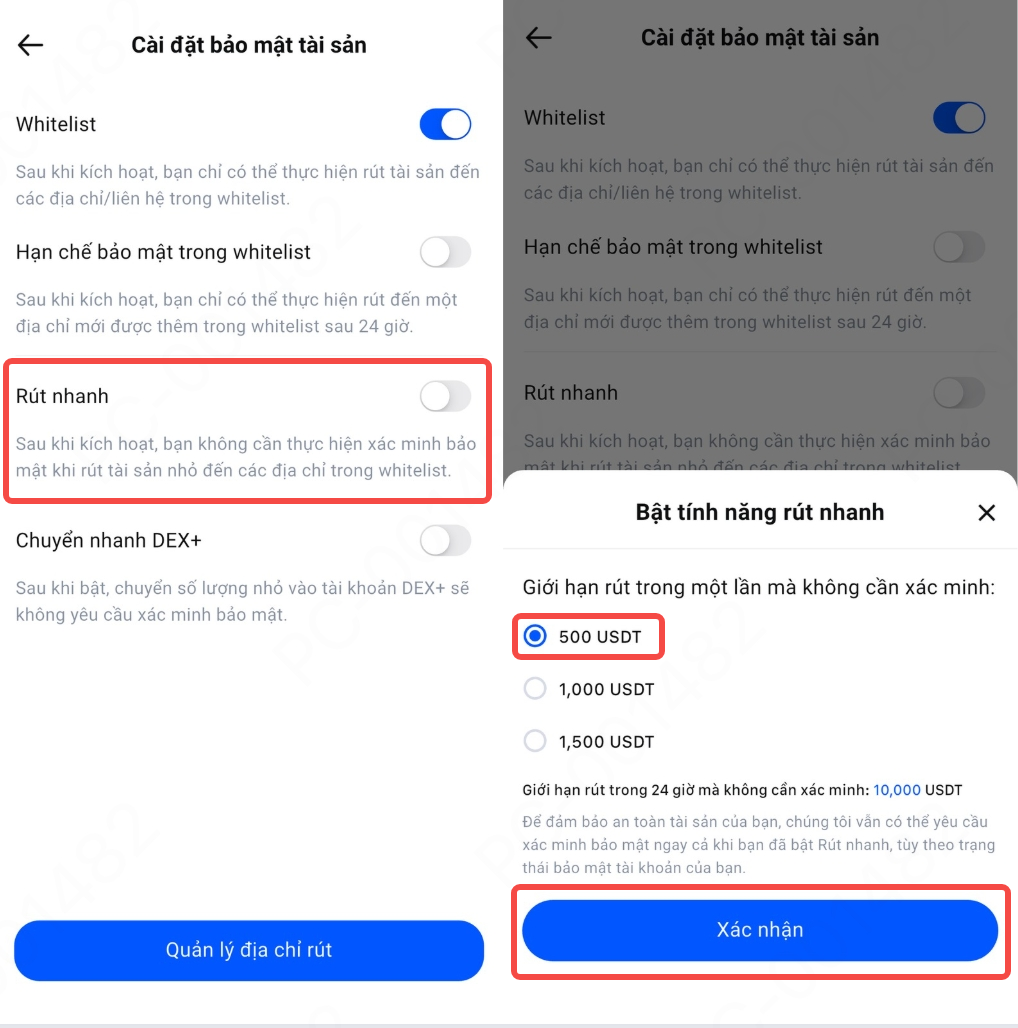 Nhấn vào nút gạt ở bên phải của "Rút nhanh", chọn hạn mức rút/chuyển trong một lần không cần xác minh. Ở đây, chúng tôi sẽ sử dụng 500 USDT làm ví dụ. Nhấn vào Xác nhận.