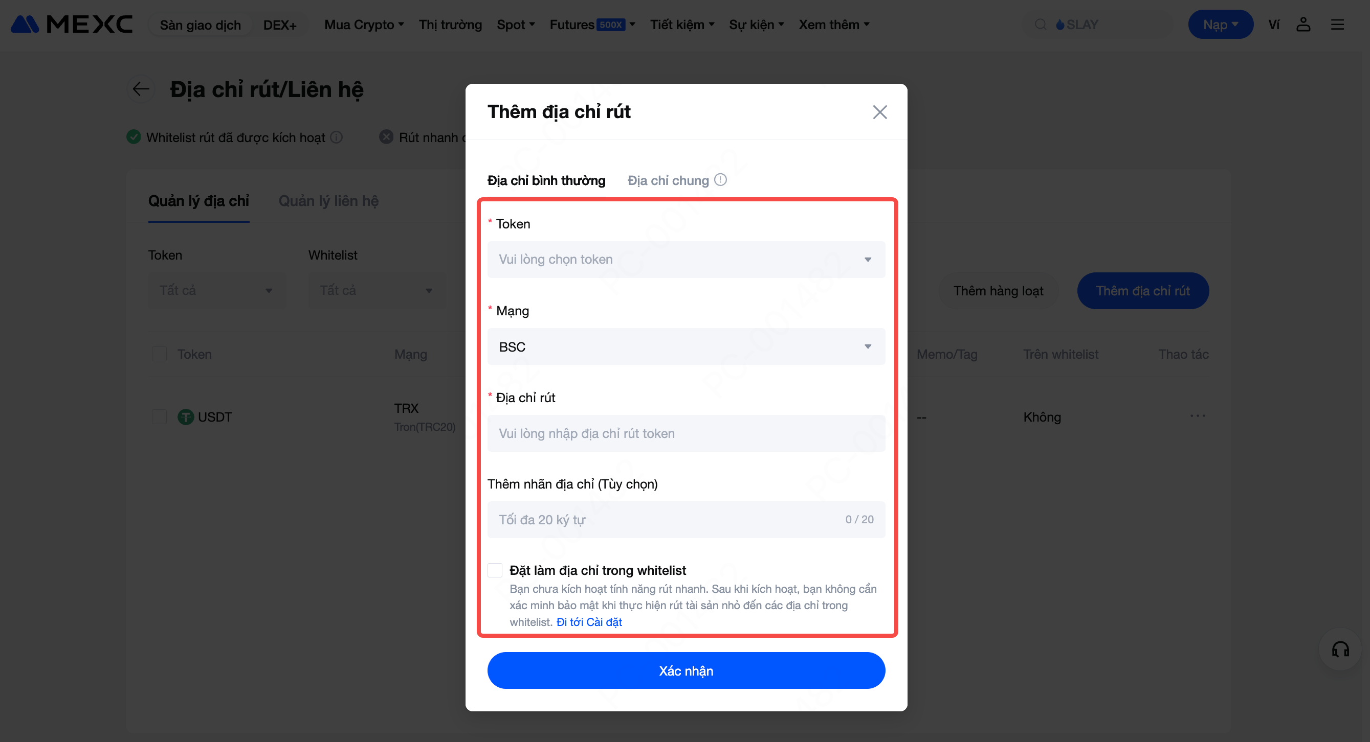 Nhấn vào Thêm địa chỉ rút, chọn Địa chỉ bình thường, điền thông tin tiền mã hoá, mạng chuyển, địa chỉ rút và nhãn địa chỉ (tùy chọn). Sau đó, đánh dấu vào ô bên cạnh "Đặt làm địa chỉ trong whitelist" và nhấn vào Xác nhận.