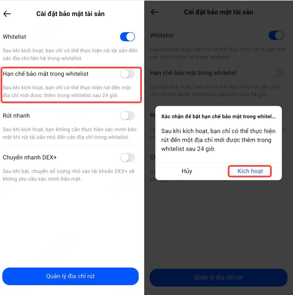 - Sau khi kích hoạt, việc rút đến các địa chỉ whitelist mới được thêm sẽ cần thời gian chờ 24 giờ.