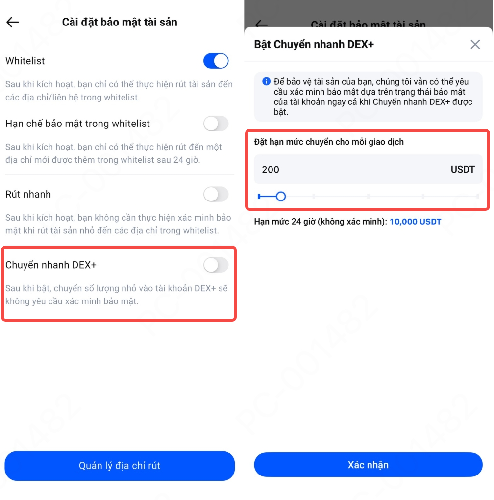 Nhấn nút gạt bên cạnh "Chuyển nhanh DEX+", nhập hạn mức chuyển được thiết lập cho mỗi giao dịch (1-2,000 USDT, ví dụ: 200 USDT), sau đó nhấn Xác nhận.