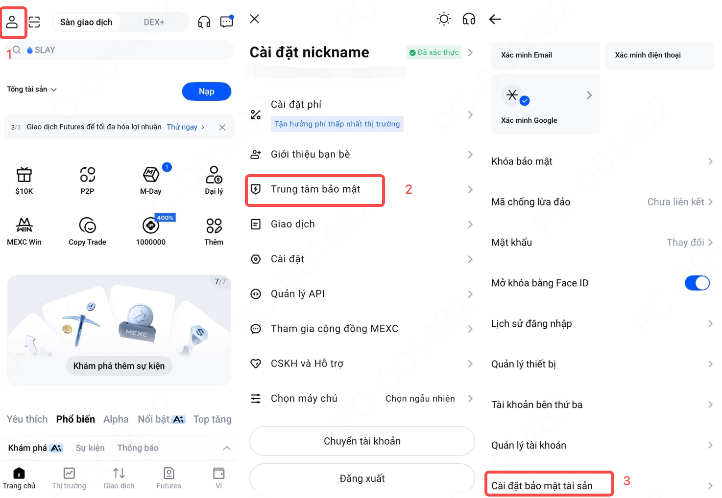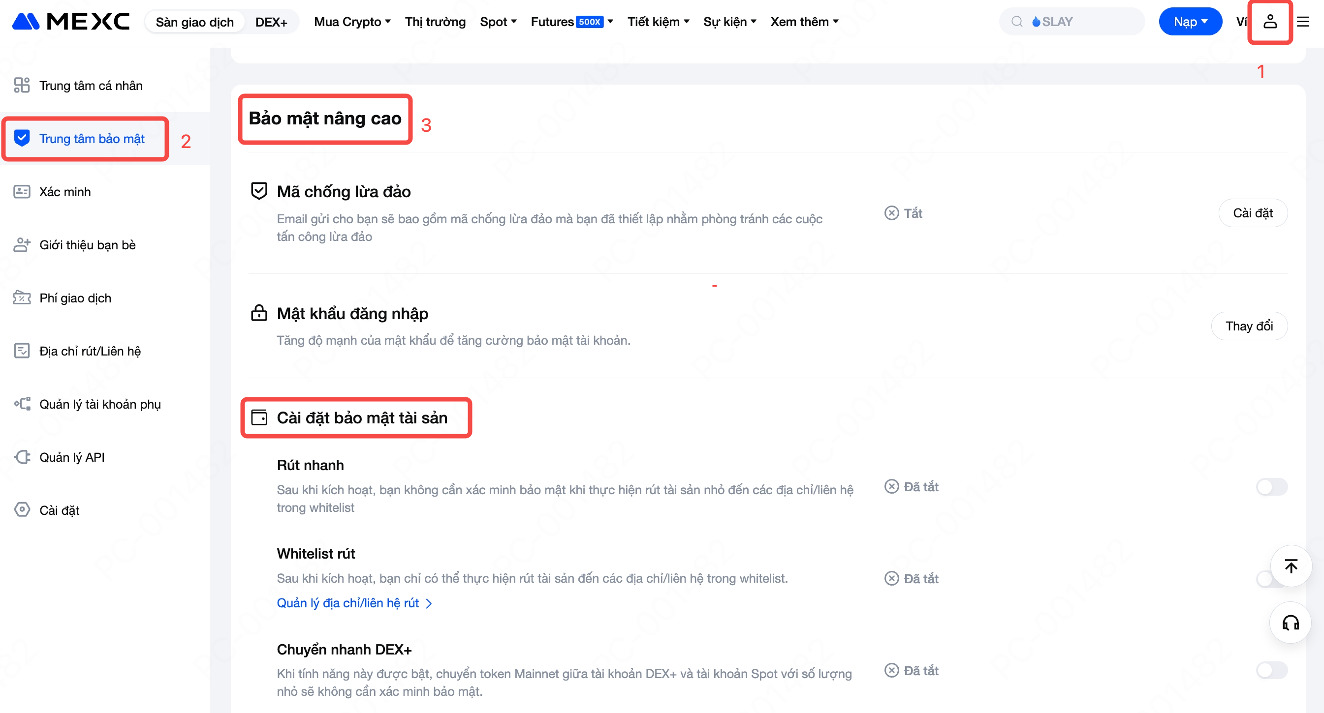 Đăng nhập MEXC, di chuột qua biểu tượng người dùng ở góc trên bên phải trang chủ và chọn Trung tâm bảo mật. Cuộn xuống phần "Bảo mật nâng cao" và bên dưới bạn sẽ tìm thấy "Cài đặt bảo mật tài sản".