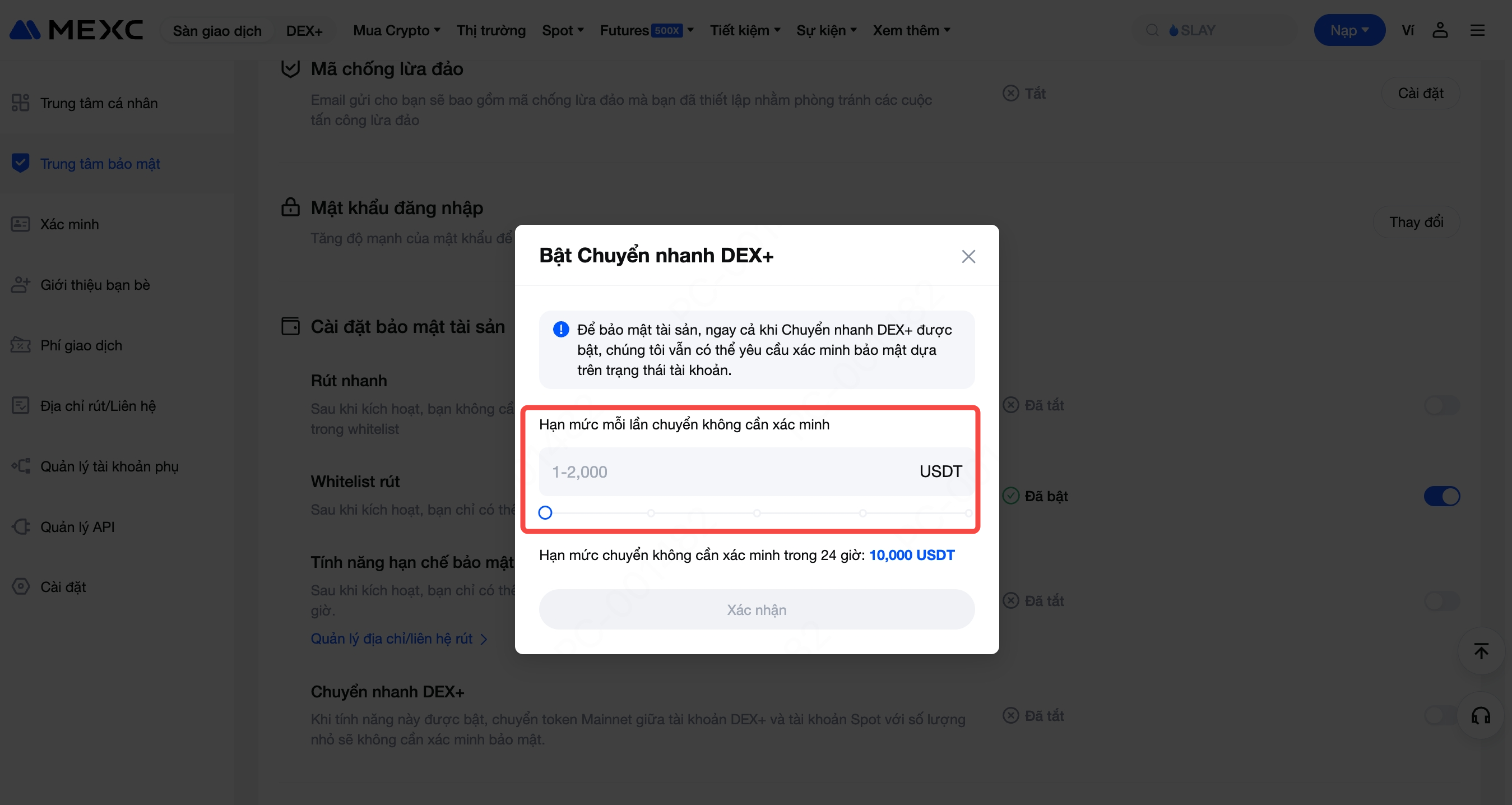 Sau khi bật, các giao dịch token Mainnet nhỏ giữa tài khoản DEX+ và tài khoản Spot của bạn sẽ không còn yêu cầu xác minh bảo mật.