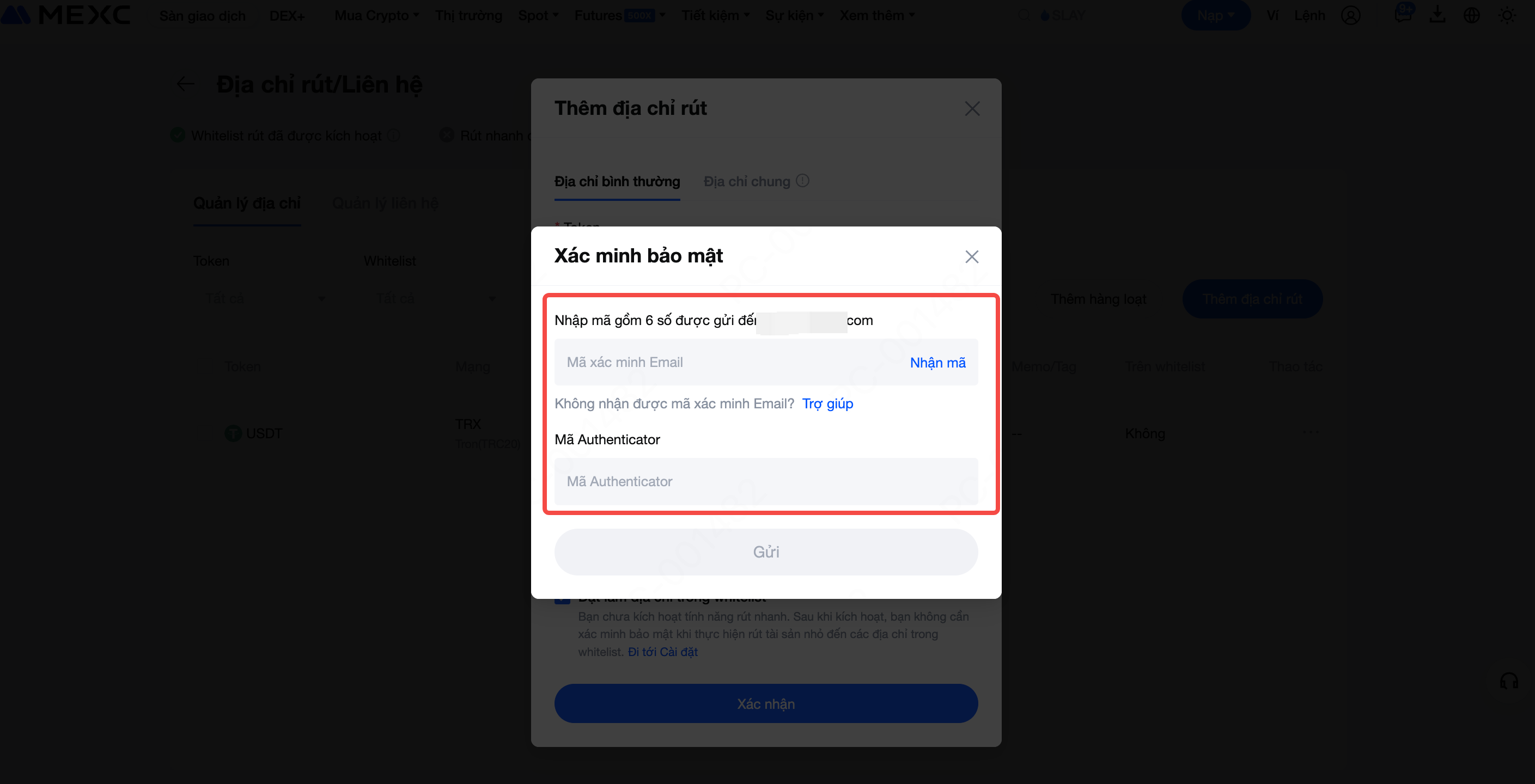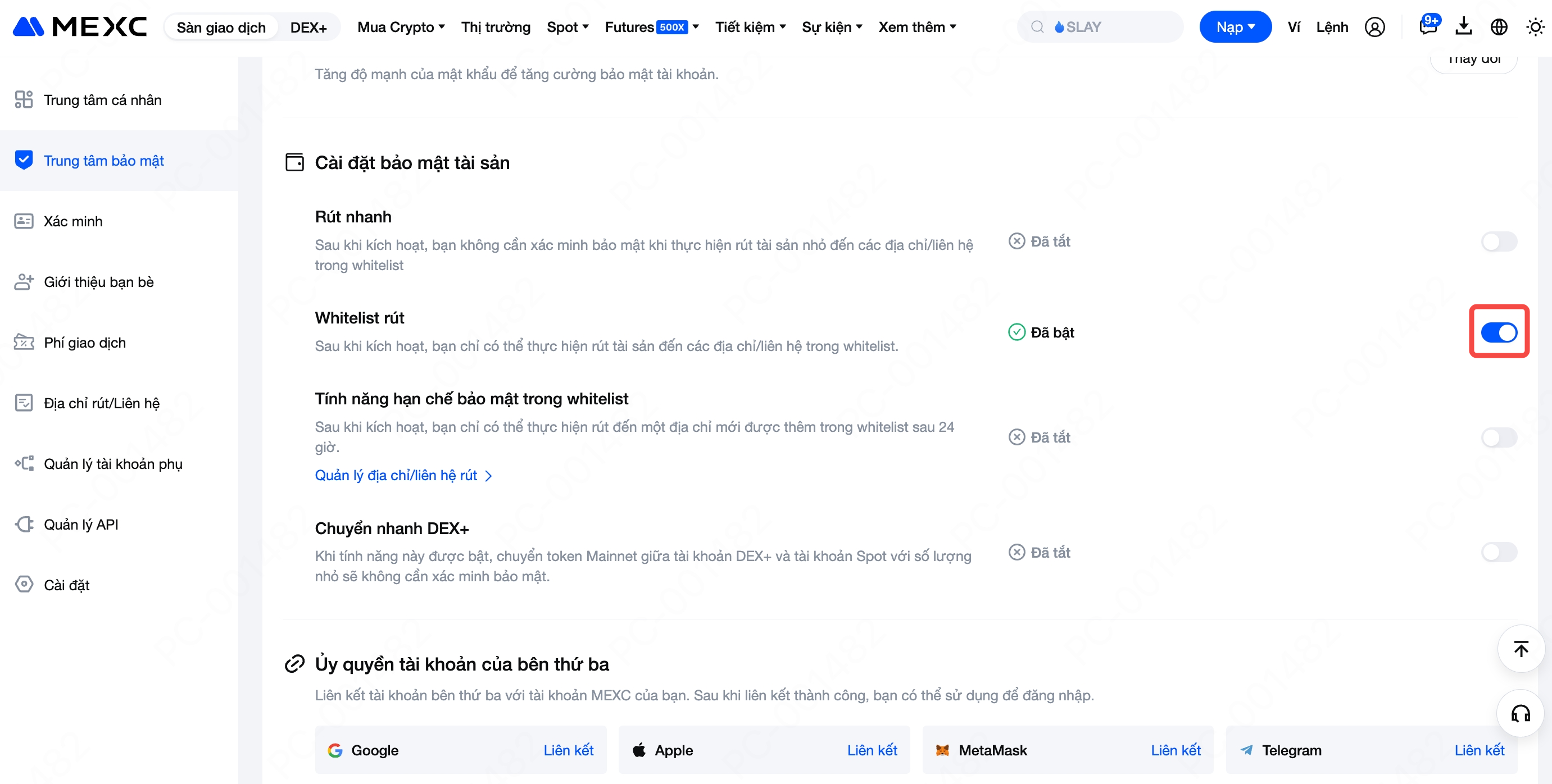 Nhấn vào nút gạt ở bên phải của Whitelist rút và hoàn thành xác minh bảo mật để bật tính năng này.