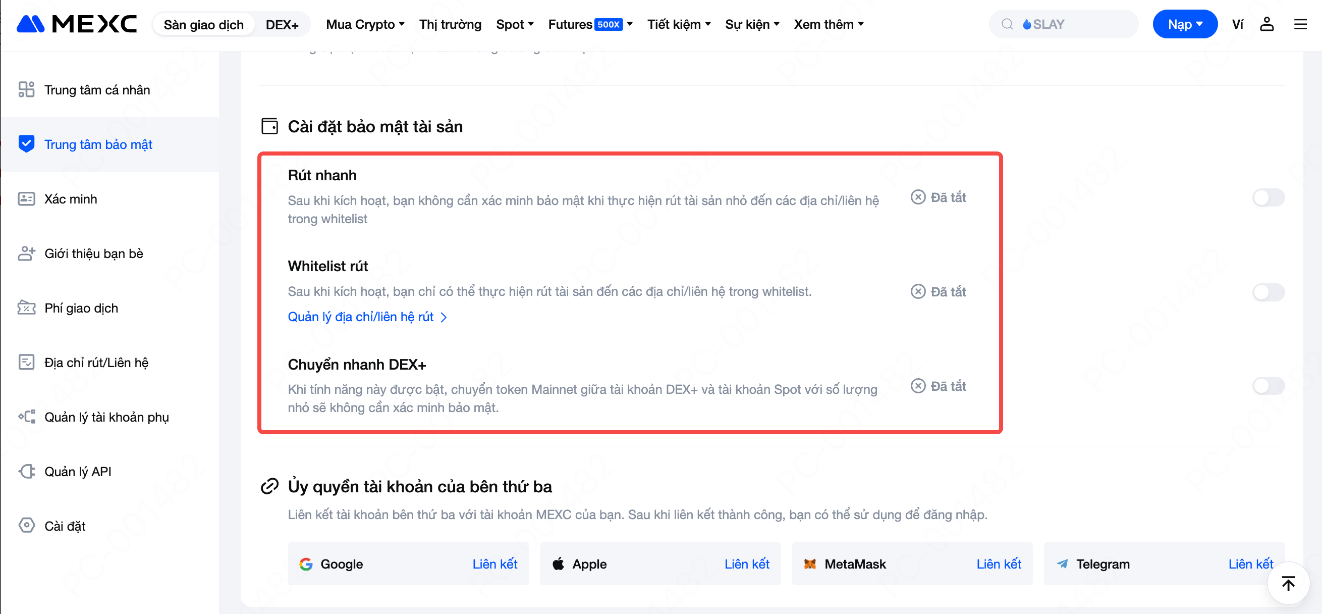 "Cài đặt bảo mật tài sản" được chia thành ba tính năng: Rút nhanh, Whitelist rút và Chuyển nhanh DEX+.