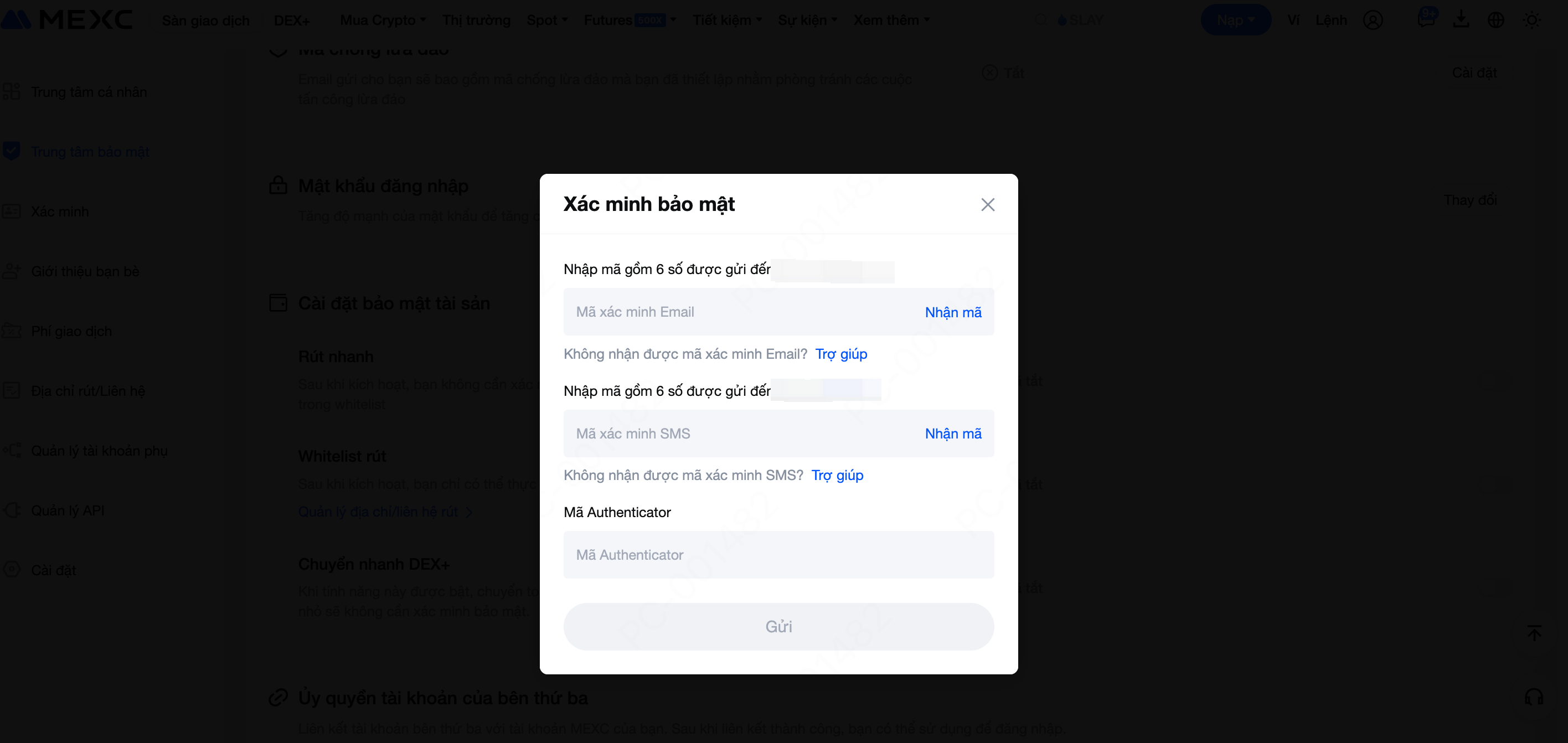 Vui lòng lưu ý việc xác minh sẽ dựa trên cài đặt xác thực hai yếu tố (2FA) mà bạn đã tự thiết lập. Trong ví dụ bên dưới, các phương thức xác minh khả dụng là xác minh Email, xác minh Google Authenticator và xác minh SMS qua số điện thoại.