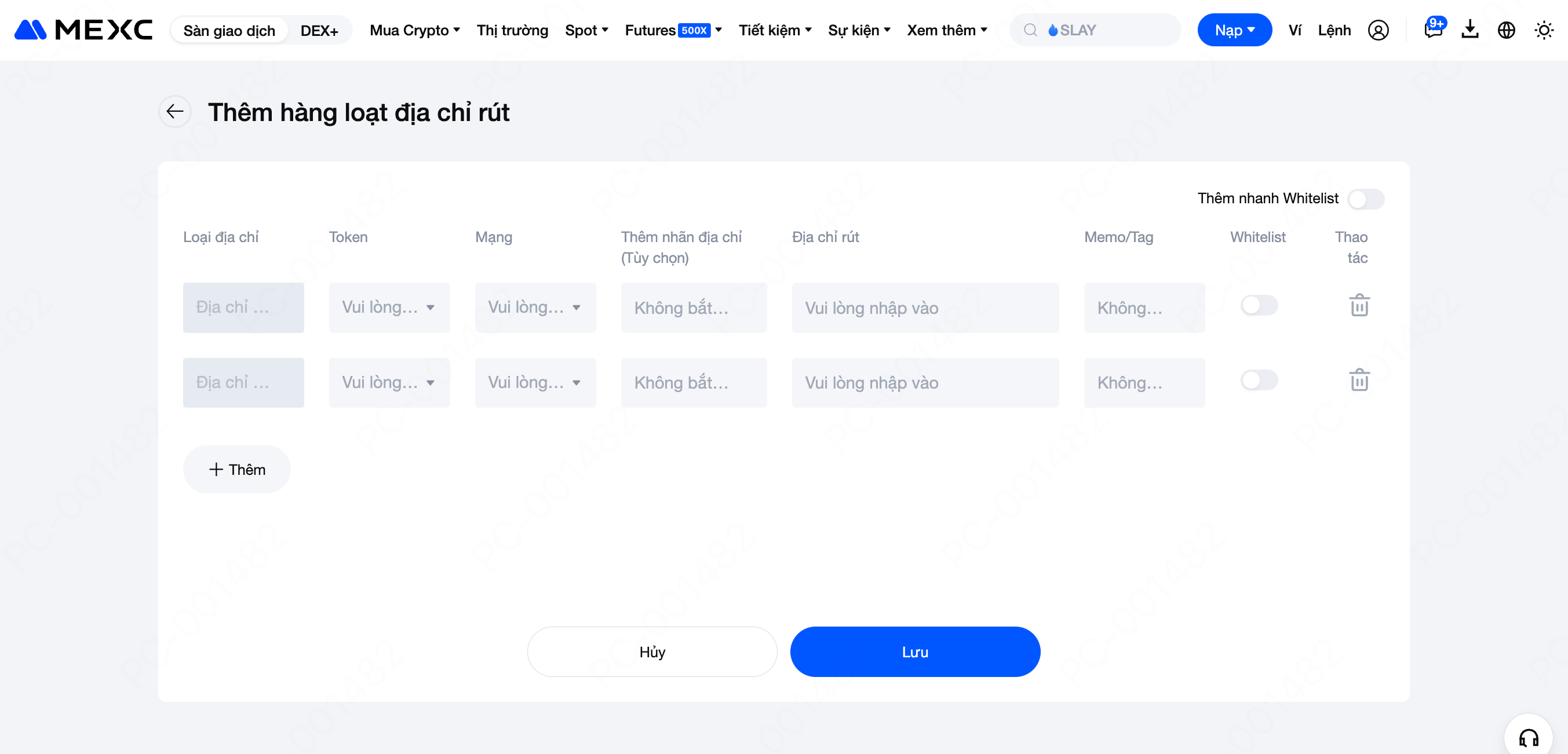 Nếu bạn muốn thêm nhiều địa chỉ vào whitelist cùng lúc, bạn có thể nhấn vào Thêm hàng loạt. Trên trang "Thêm hàng loạt địa chỉ rút", điền thông tin tiền mã hoá, mạng chuyển, nhãn địa chỉ (tùy chọn), địa chỉ rút, Memo/Tag (tùy chọn) và bật tùy chọn "Whitelist". Sau khi đã thêm tất cả các địa chỉ, vui lòng nhấn Lưu.