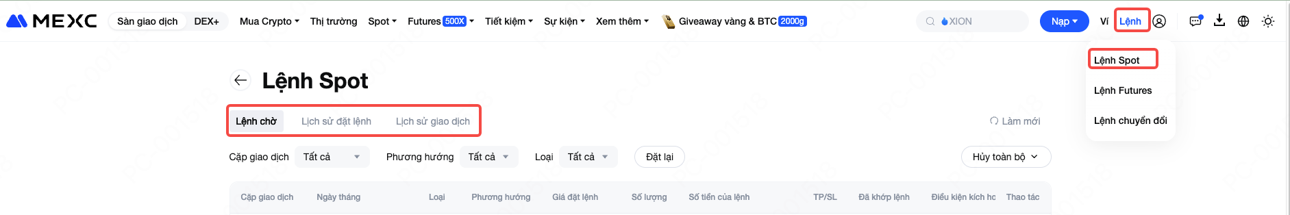 Bạn cũng có thể kiểm tra lệnh của mình trên trang Lệnh Spot. Trên thanh điều hướng, nhấn Lệnh → Lệnh Spot, sau đó xem lệnh tại các mục Lệnh chờ, Lịch sử đặt lệnh hoặc Lịch sử giao dịch trên trang Lệnh Spot.